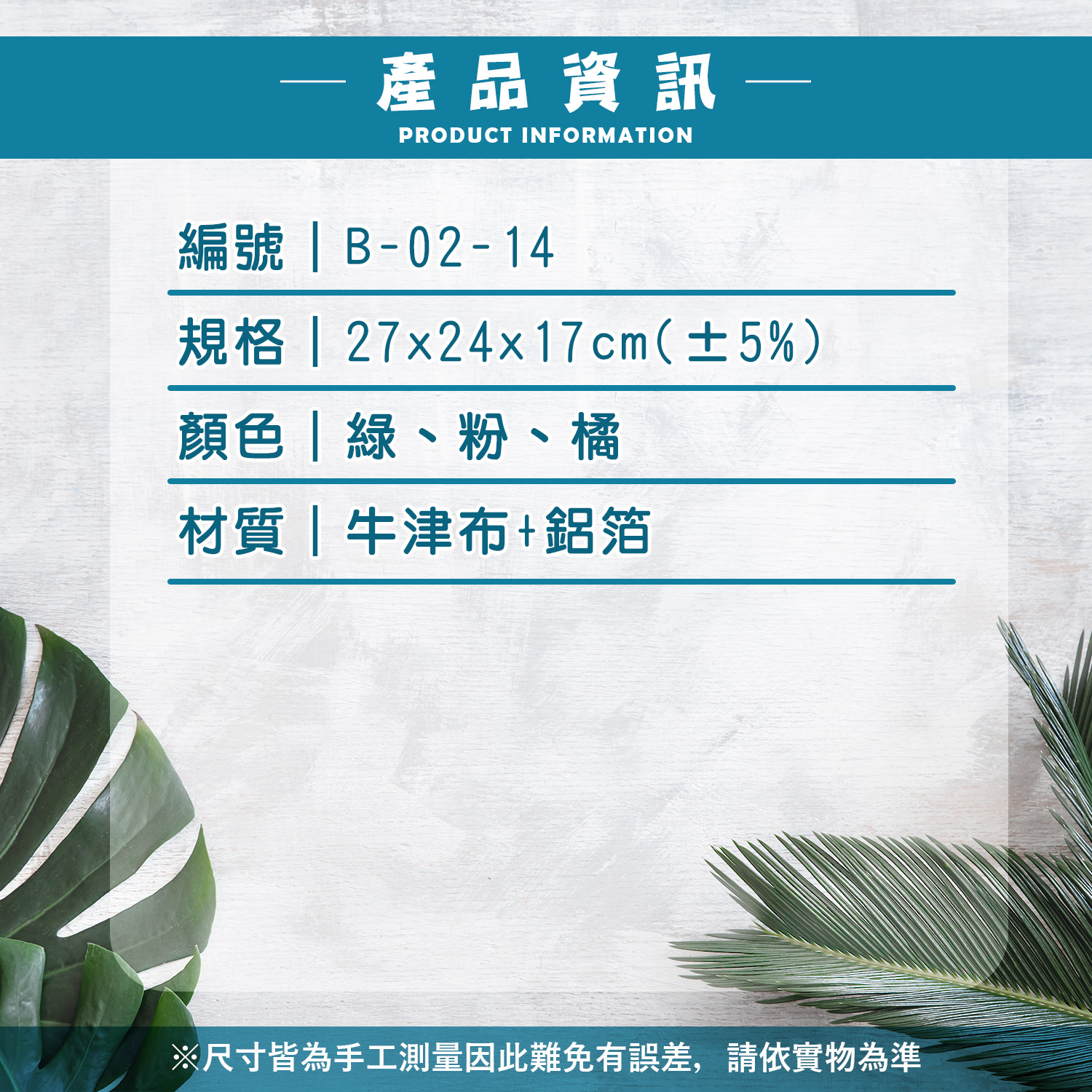 編號|B-02-14規格|27x24x17cm(±5%)顏色|綠、粉、橘材質|牛津布+鋁箔