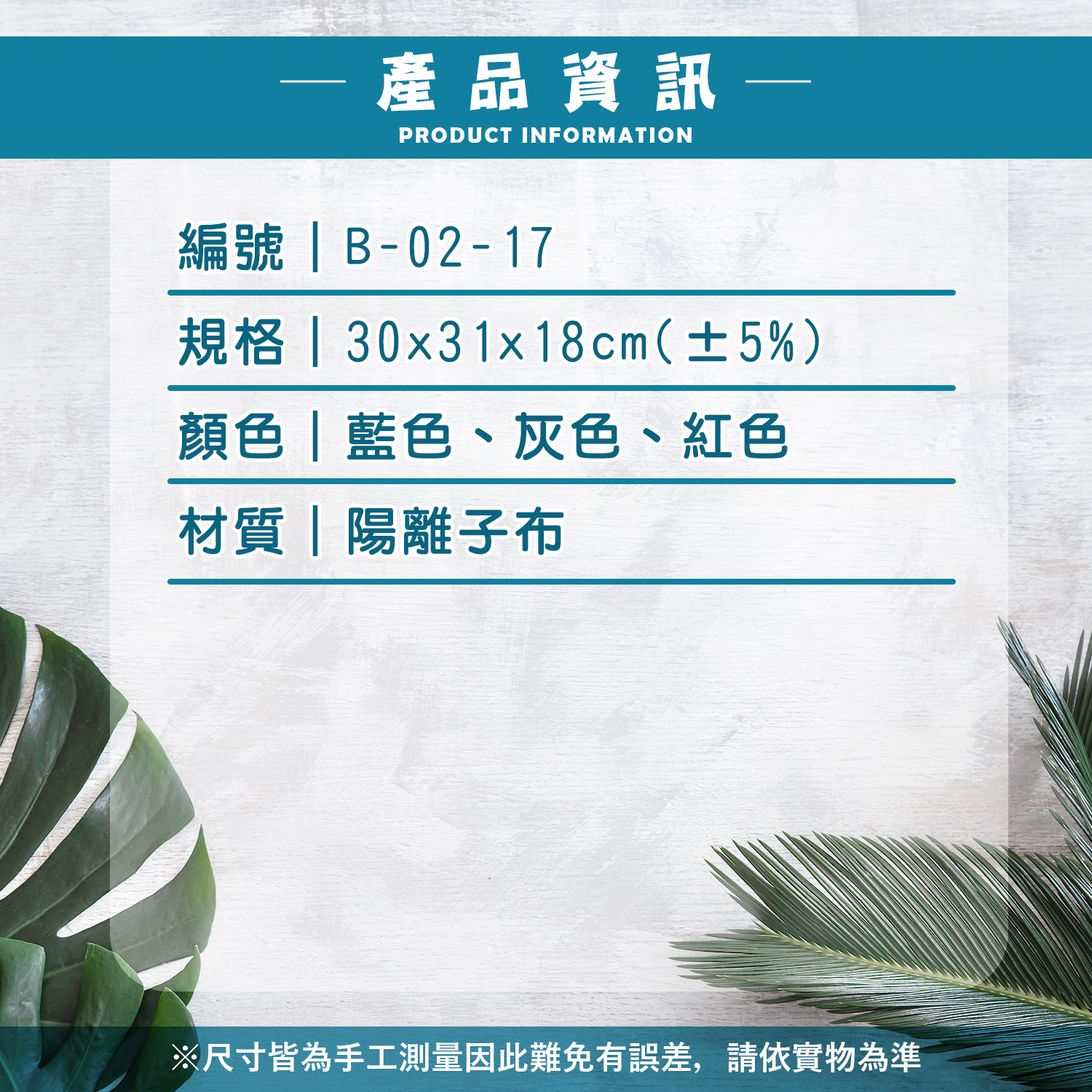 編號|B-02-17規格|30x31x18cm(±5%)顏色|藍色、灰色、紅色材質|陽離子布