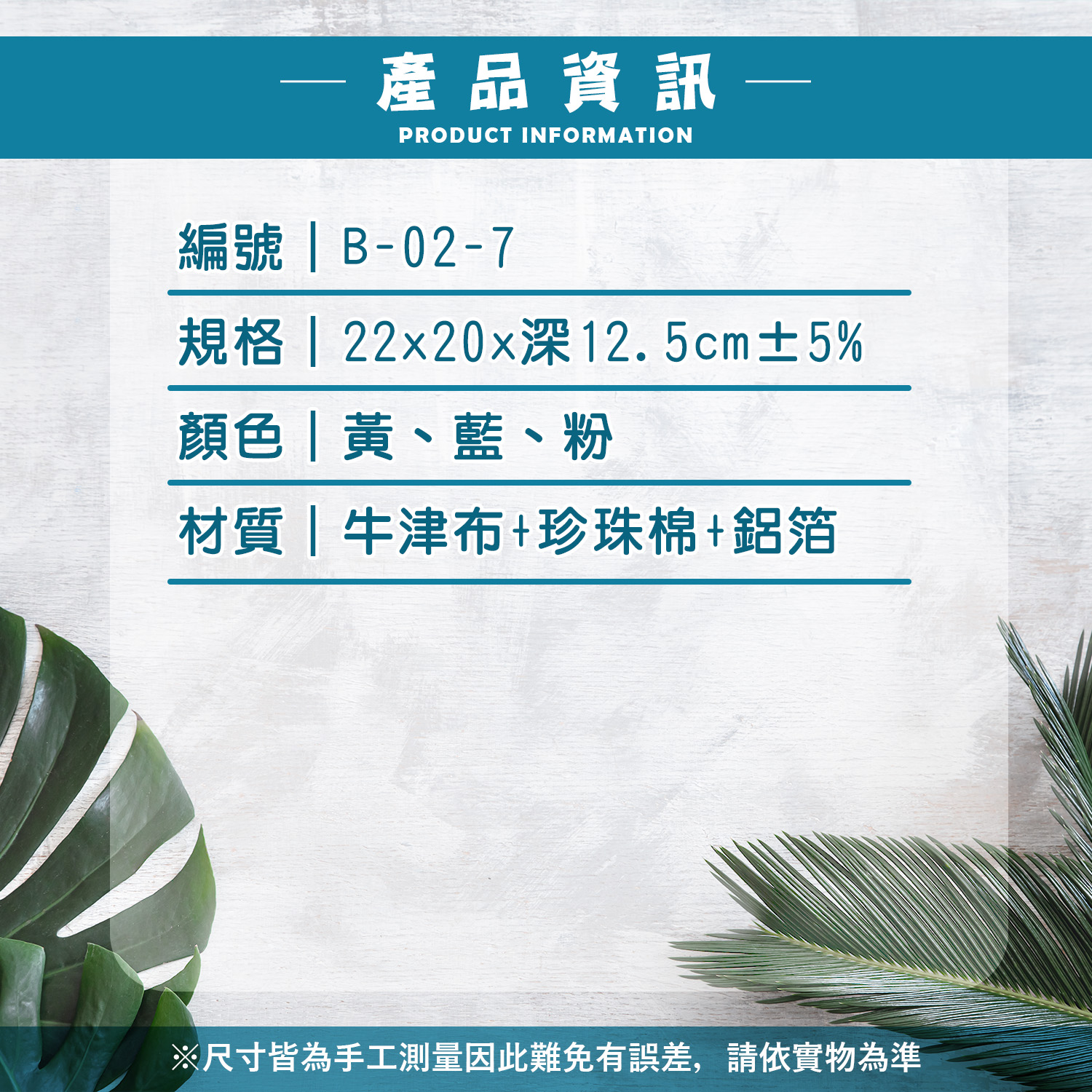 編號|B-02-7規格|22x20x深12.5cm±5%顏色|黃、藍、粉材質|牛津布+珍珠棉+鋁箔