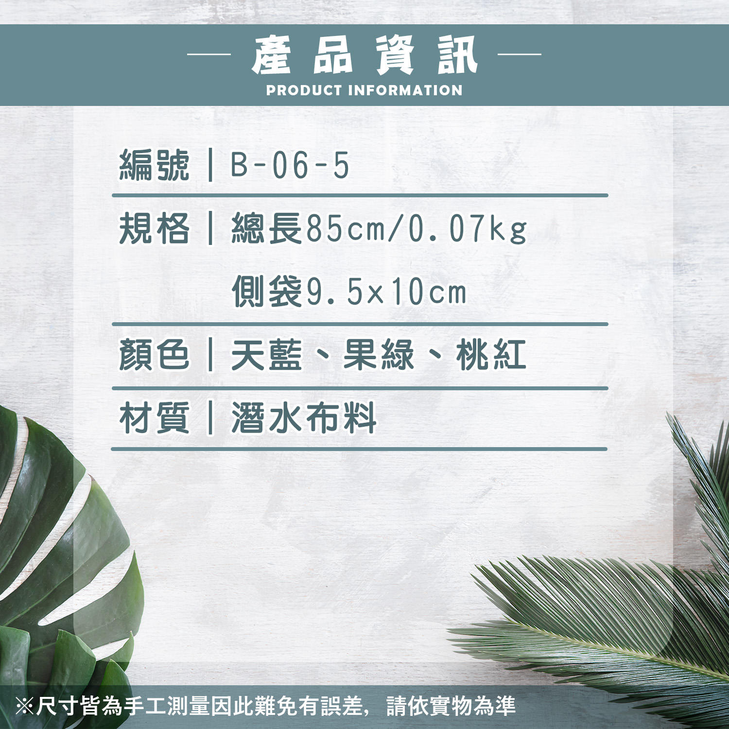 編號|B-06-5規格|總長─85cm / 0.07kg 側袋─9.5x10cm顏色|天藍、果綠、桃紅材質|潛水布料