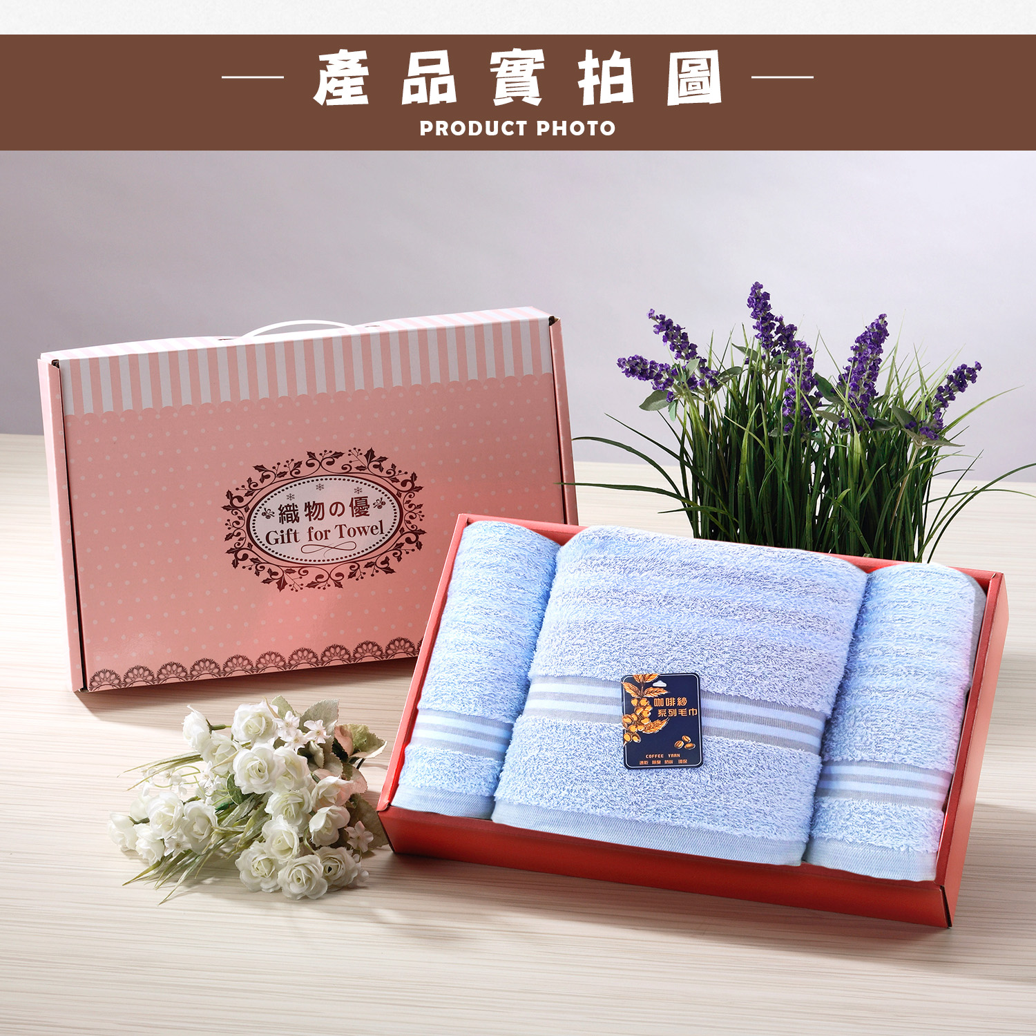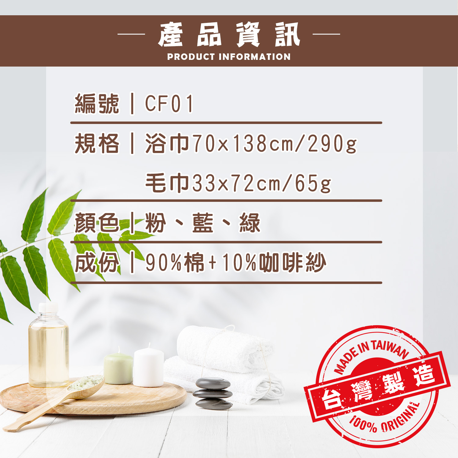 編號|CF01規格|浴巾70x138cm / 290g 毛巾33x72cm / 65g顏色|粉、藍、綠成份|90%棉+10%咖啡紗製程|全程台灣製造