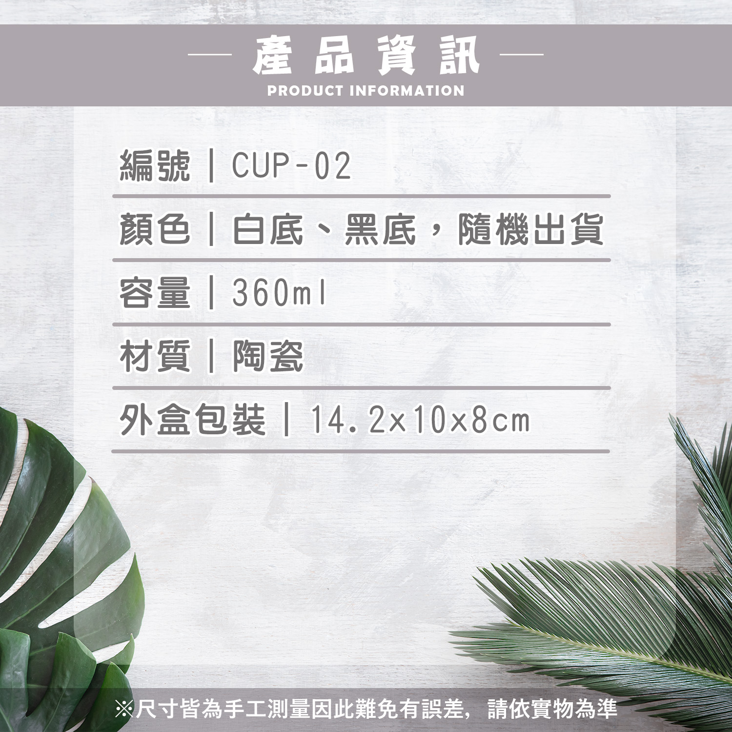 編號|CUP-02顏色|白底、黑底,隨機出貨容量|360ml材質|陶瓷外盒包裝|14.2x10x8cm