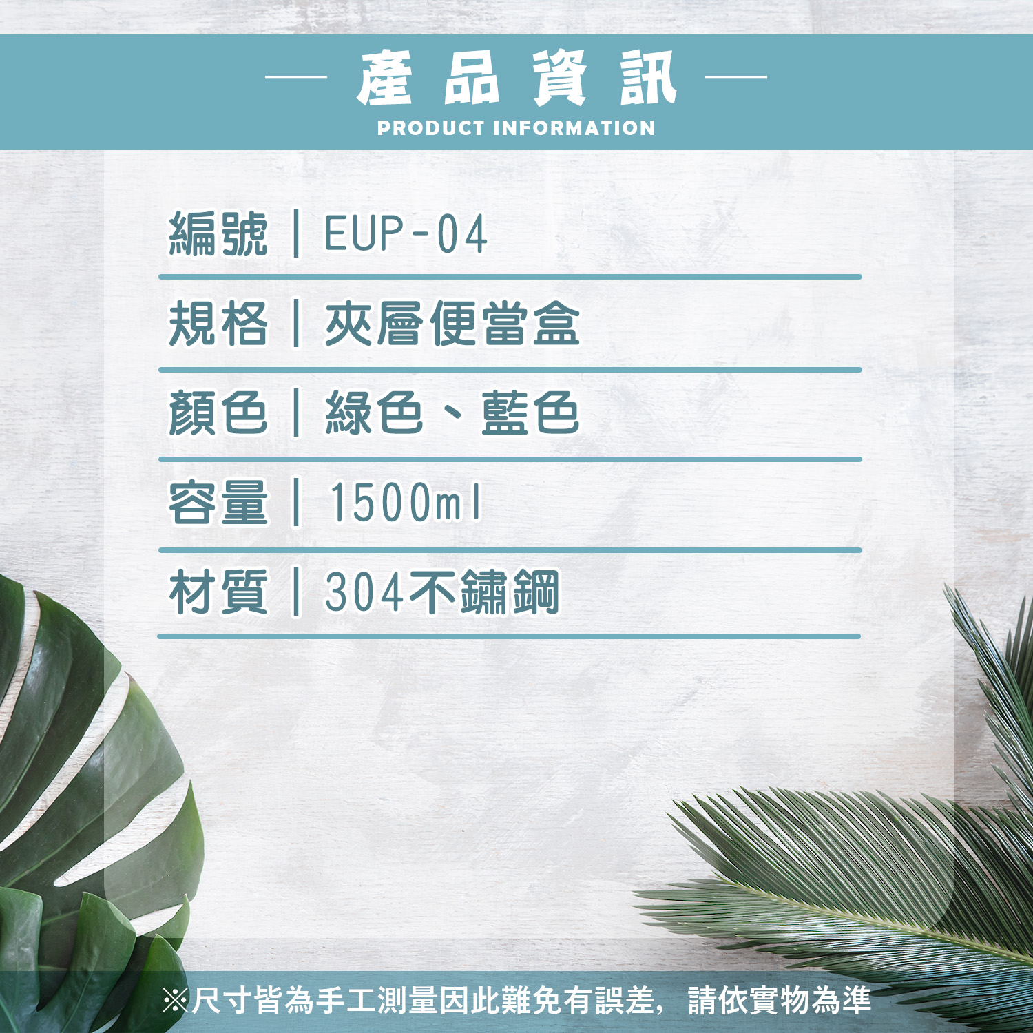 編號|EUP-04規格|夾層便當盒顏色|綠色、藍色容量|1500ml材質|304不鏽鋼