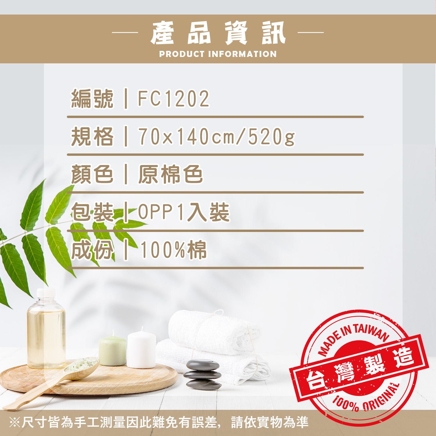 編號|FC1202規格|70x140cm / 520g 顏色|原棉色 包裝|OPP1入裝成份|100%棉製程|全程台灣製造