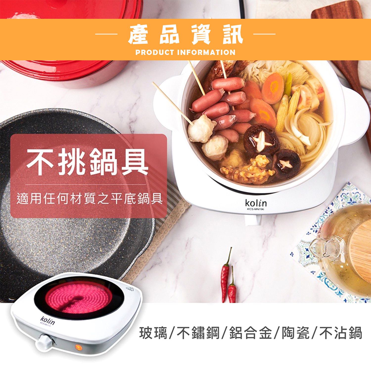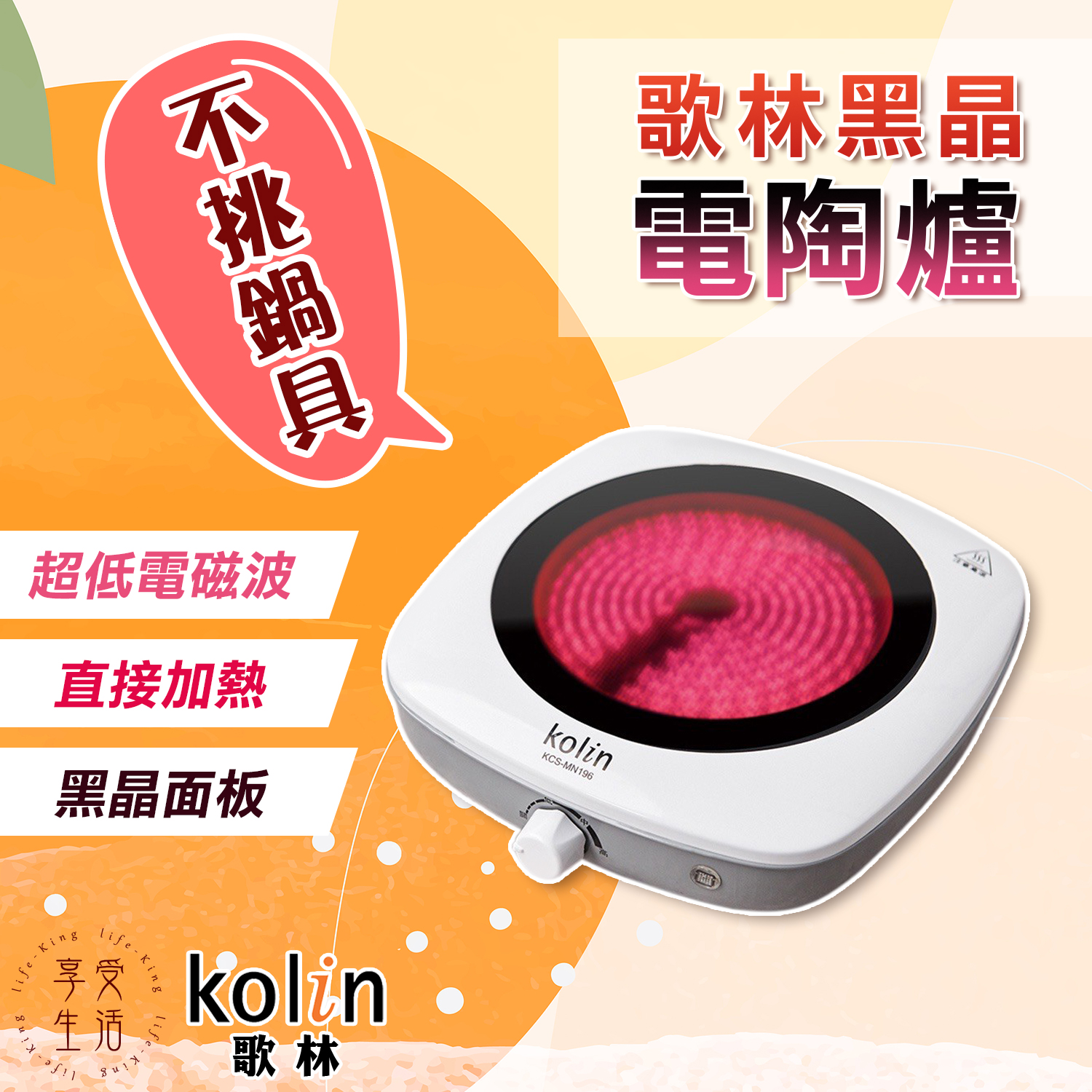 【商品特性】 1.不挑鍋具,適用任何材質之平底鍋具。 2.直接導熱技術,超低電磁波。 3.黑晶面板,不易卡垢好清洗。 4.微調溫控開關,可依烹飪需求設定溫度。