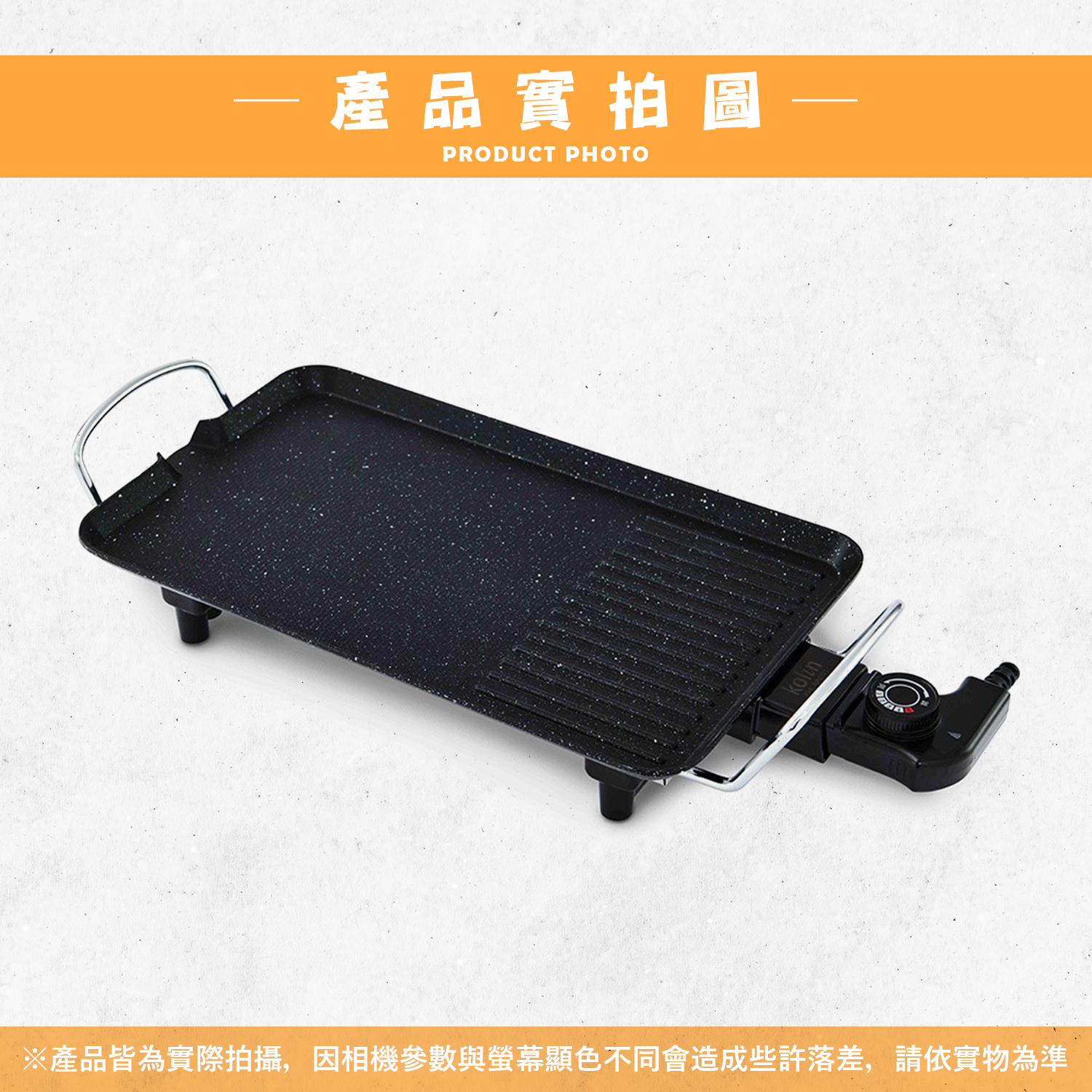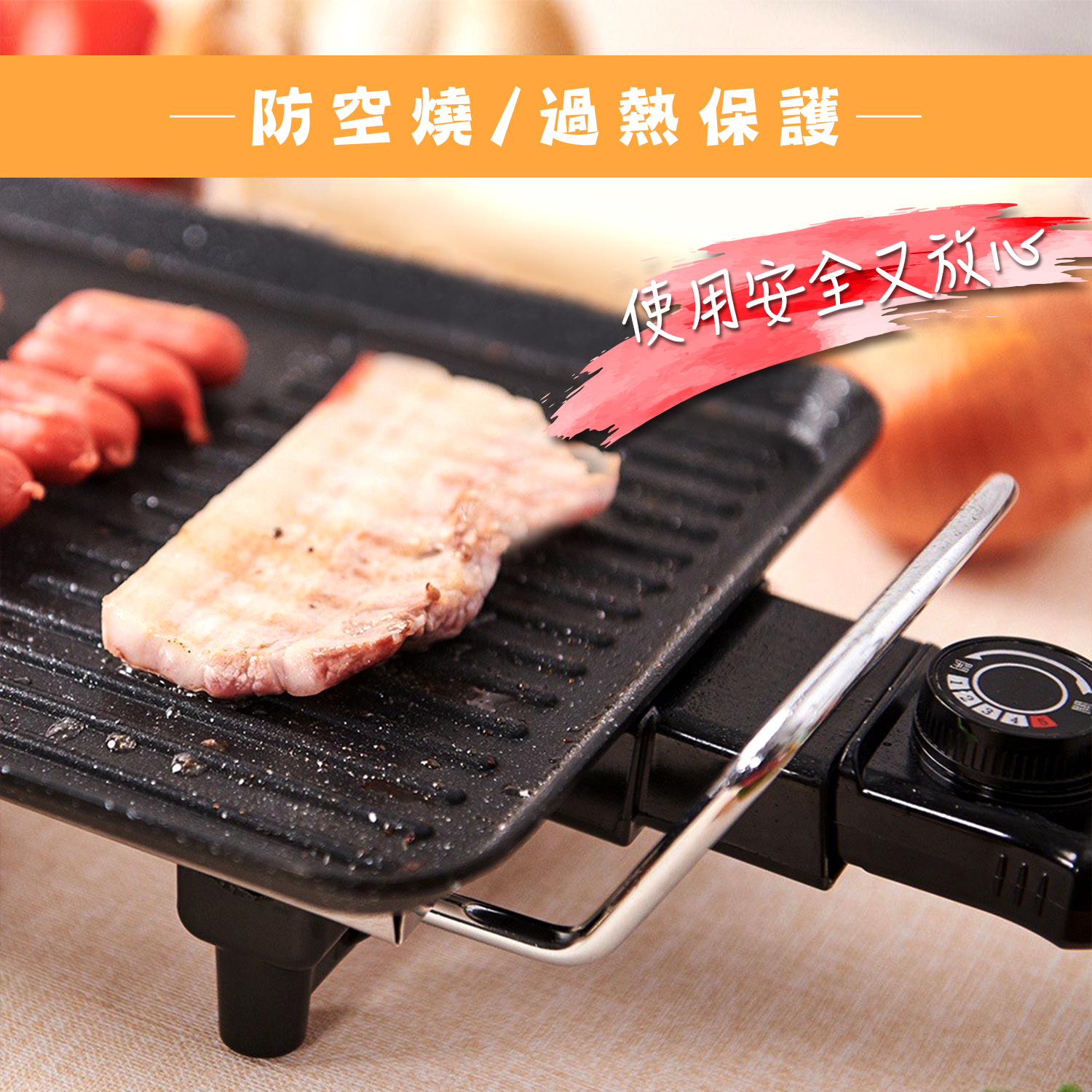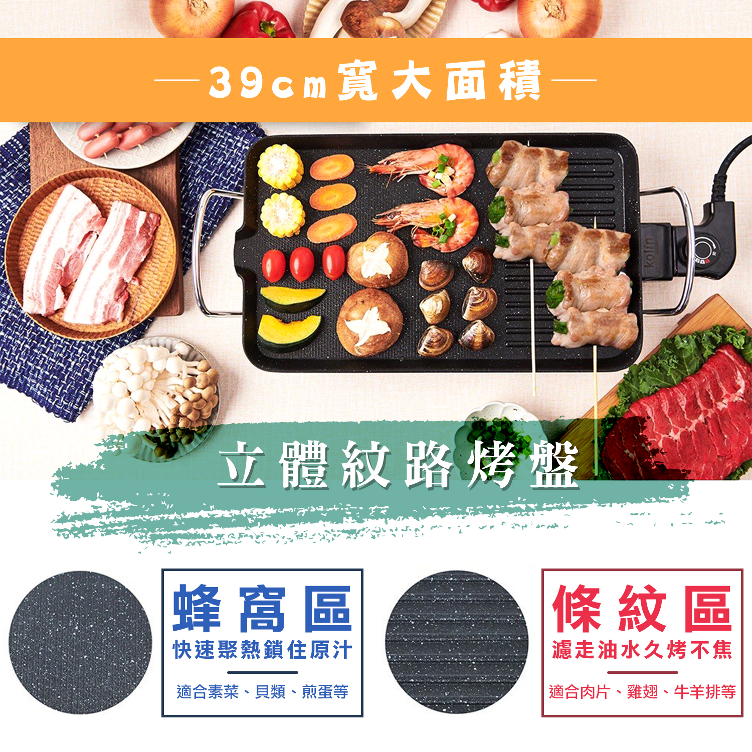 【商品特性】 1.39公分寬大面積,立體紋路烤盤。 2.無段調溫火力,最高240度,依照不同料理自由選擇。 3.麥飯石不沾塗層,耐用好清洗。 4.瀝油孔設計,可排出多餘油脂,健康少油煙。 5.分離式溫度控制電源線,使用安全,收納方便。 6.底部大面積加熱管,加熱快速,傳導均勻。 7.薄型機身設計,不佔空間好收納。 8.防乾燒過熱斷電保護裝置。