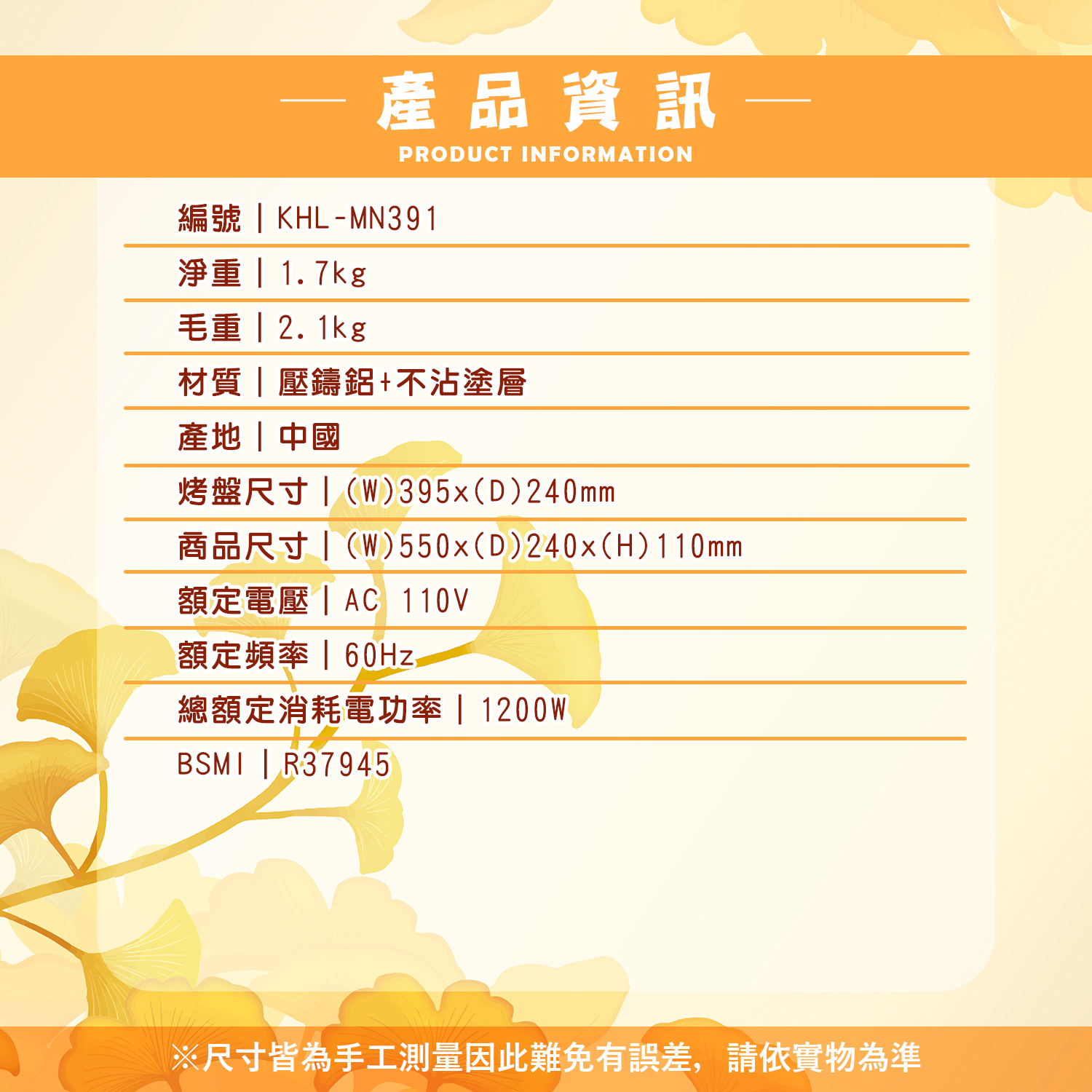 編號|KHL-MN391淨重|1.7kg毛重|2.1kg材質|壓鑄鋁+不沾塗層產地|中國烤盤尺寸|(W)395x(D)240mm商品尺寸|(W)550x(D)240x(H)110mm額定電壓|AC 110V額定頻率|60Hz總額定消耗電功率|1200WBSMI|R37945