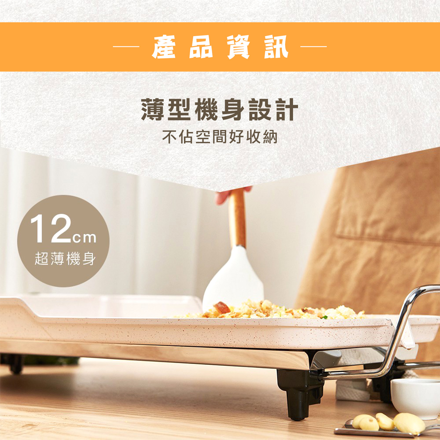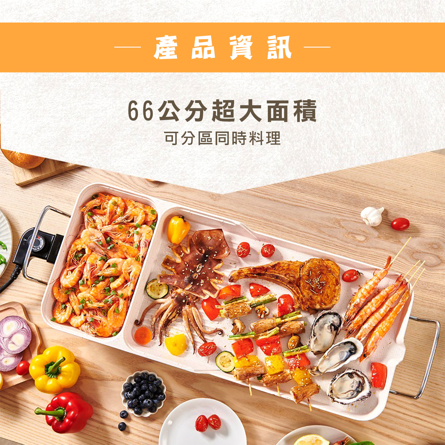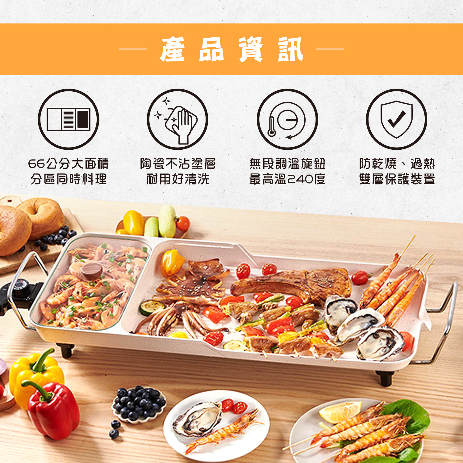【商品特性】 1.66公分超大面積,可分區多功能料理。 2.煎煮火鍋區、深紋油切烤盤區、網格平煎烤盤區。 3.陶瓷不沾塗層,耐用好清洗。 4.無段調溫火力,最高240度,依照不同料理自由選擇。 5.瀝油孔設計,可排出多餘油脂,健康少油煙。 6.分離式溫度控制電源線,使用安全,收納方便。 7.底部大面積加熱管,加熱快速,傳導均勻。 8.薄型機身設計,不佔空間好收納。 9.防乾燒及過熱斷電保護裝置。