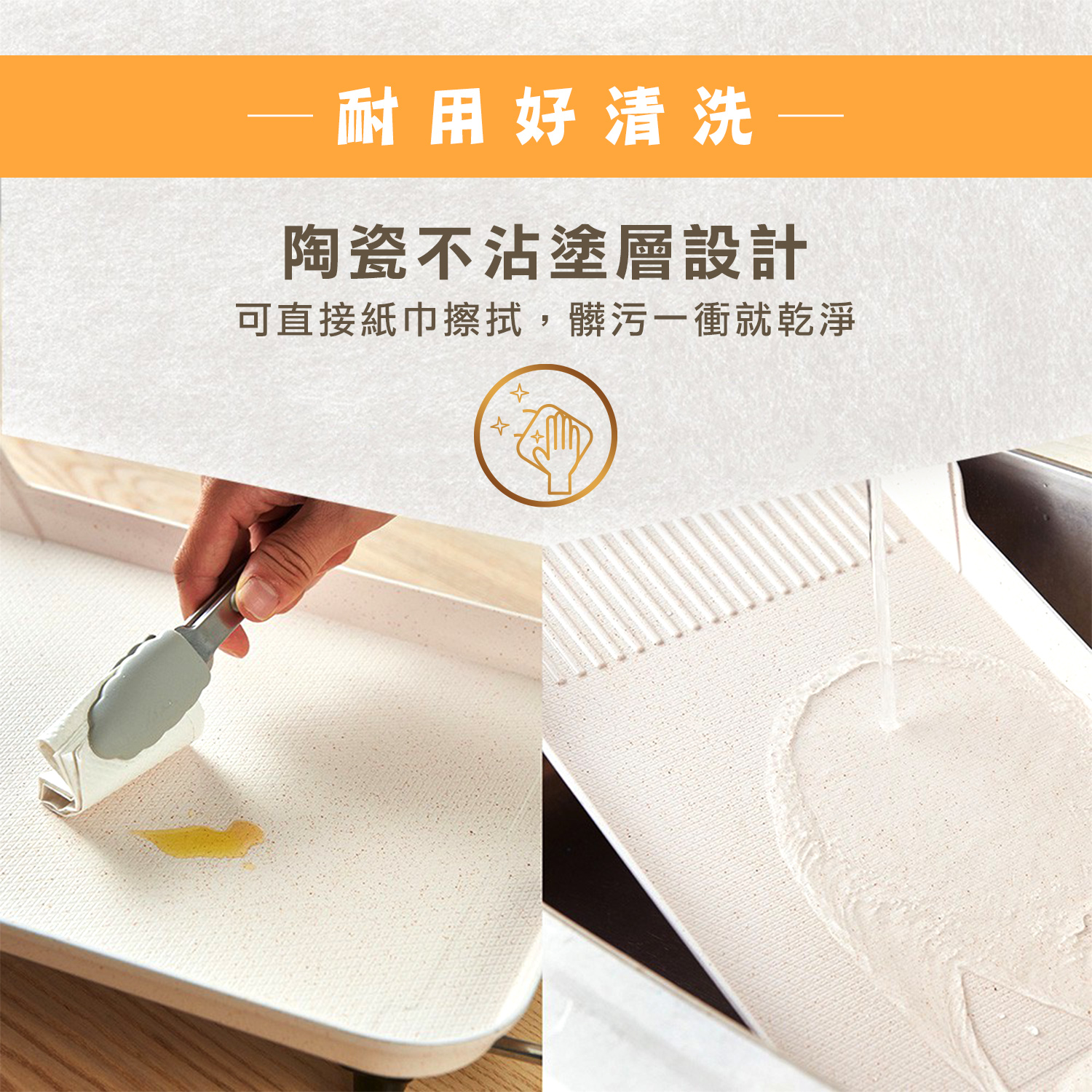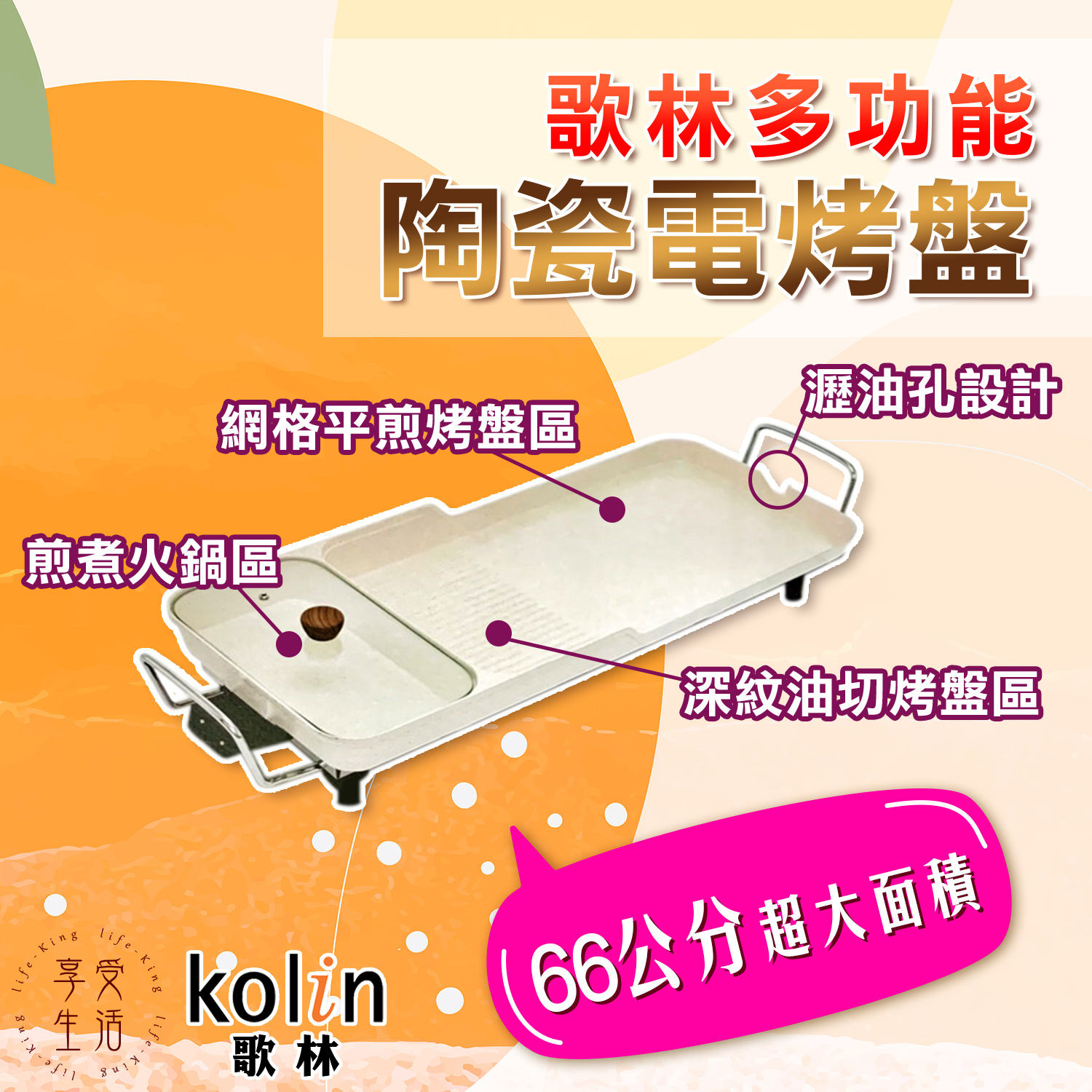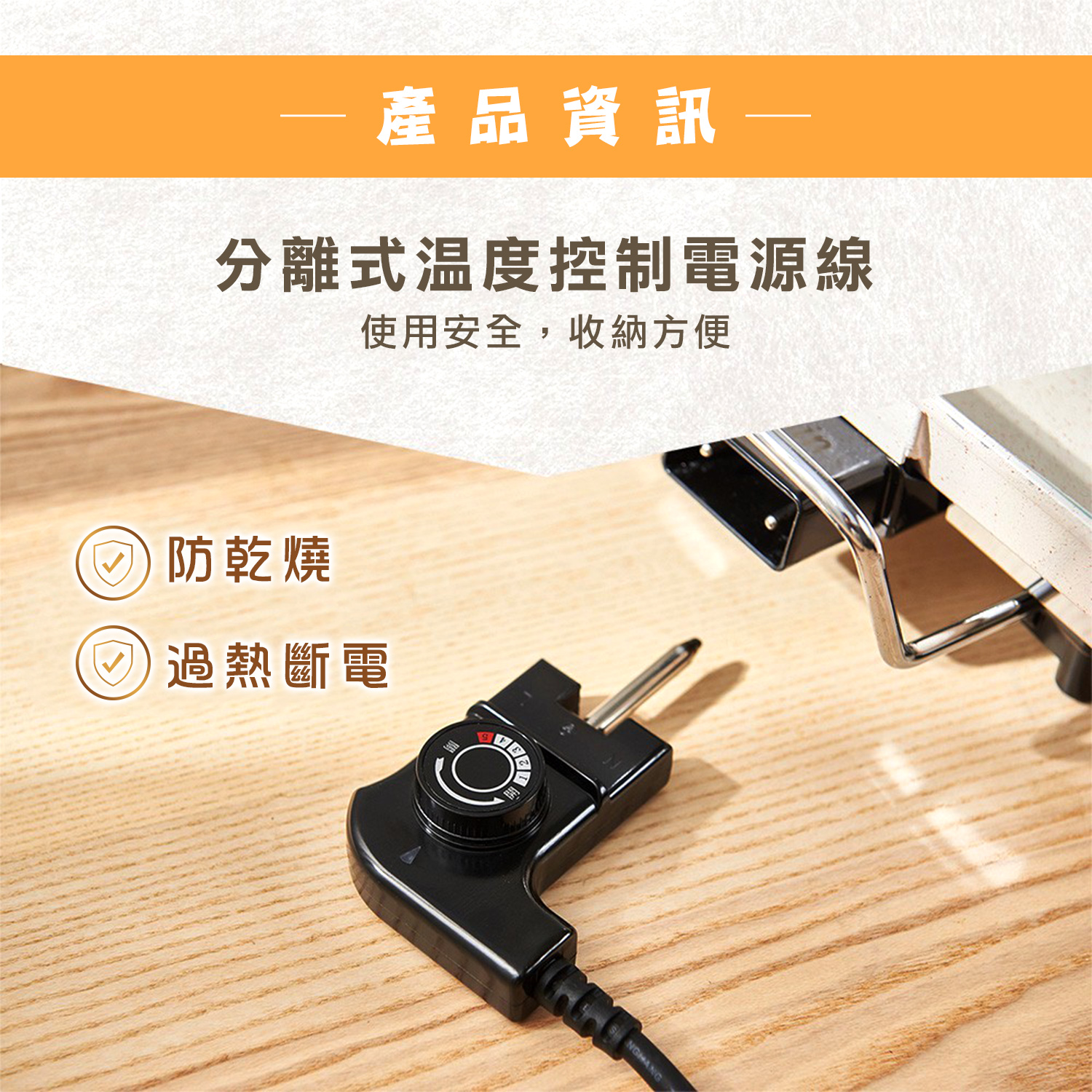 【商品特性】 1.66公分超大面積,可分區多功能料理。 2.煎煮火鍋區、深紋油切烤盤區、網格平煎烤盤區。 3.陶瓷不沾塗層,耐用好清洗。 4.無段調溫火力,最高240度,依照不同料理自由選擇。 5.瀝油孔設計,可排出多餘油脂,健康少油煙。 6.分離式溫度控制電源線,使用安全,收納方便。 7.底部大面積加熱管,加熱快速,傳導均勻。 8.薄型機身設計,不佔空間好收納。 9.防乾燒及過熱斷電保護裝置。
