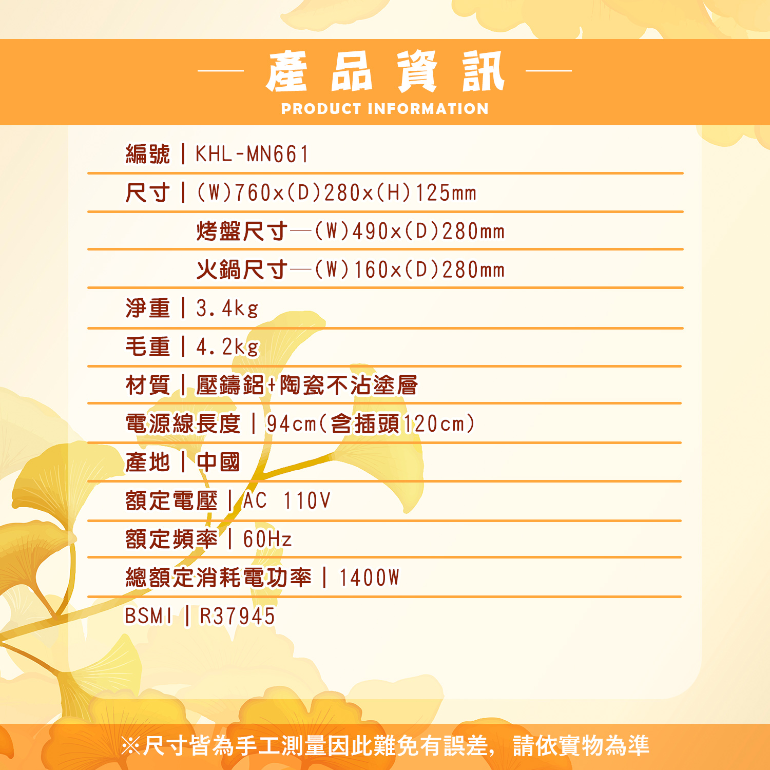 編號|KHL-MN661尺寸|(W)760x(D)280x(H)125mm 烤盤尺寸─(W)490x(D)280mm 火鍋尺寸─(W)160x(D)280mm淨重|3.4kg毛重|4.2kg材質|壓鑄鋁+陶瓷不沾塗層電源線長度|94cm(含插頭120cm)產地|中國額定電壓|AC 110V額定頻率|60Hz總額定消耗電功率|1400WBSMI|R37945