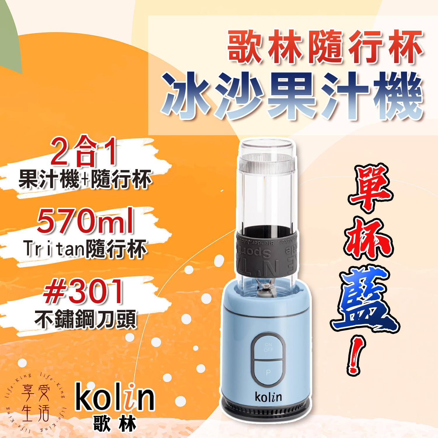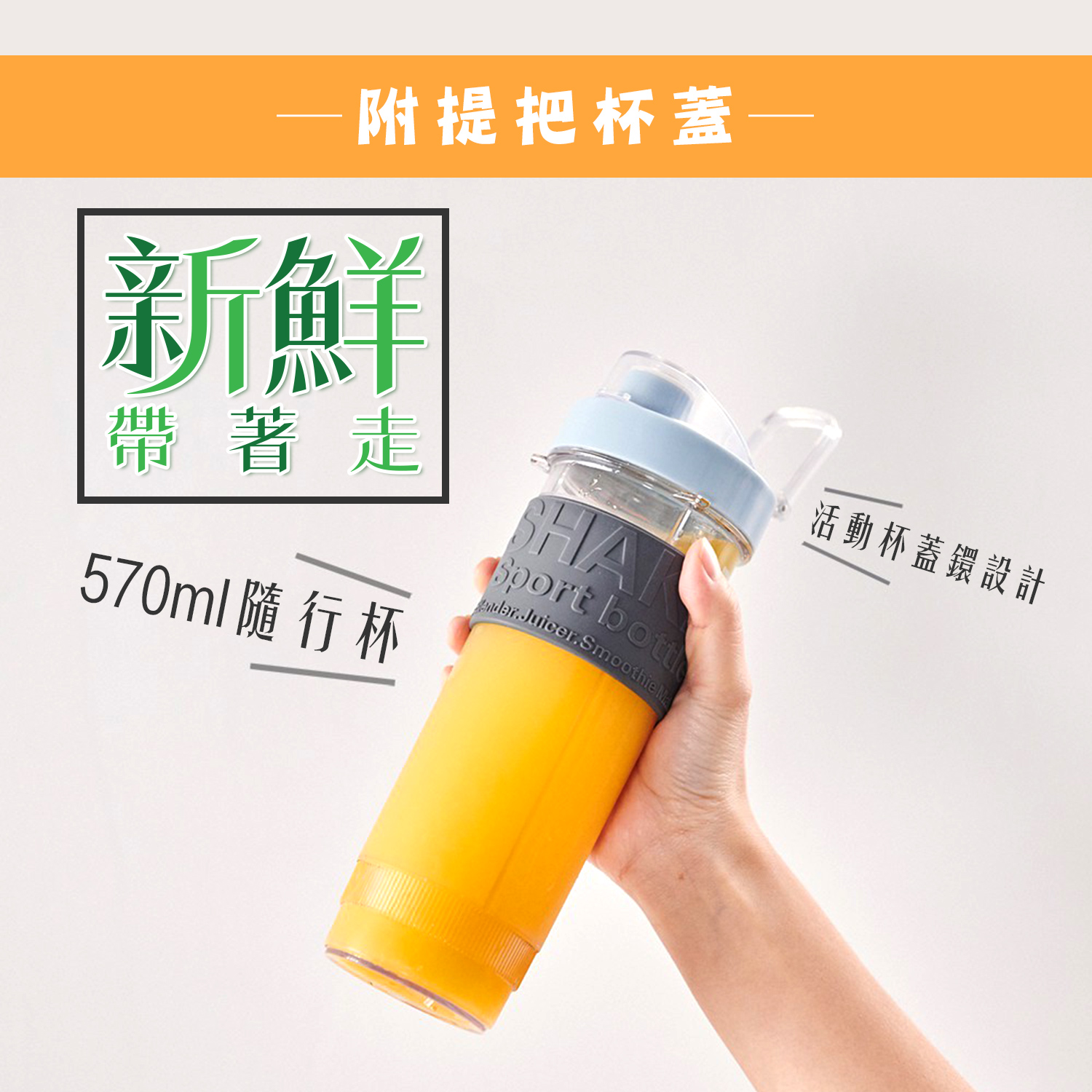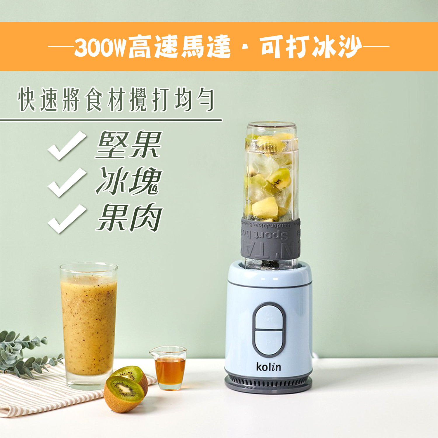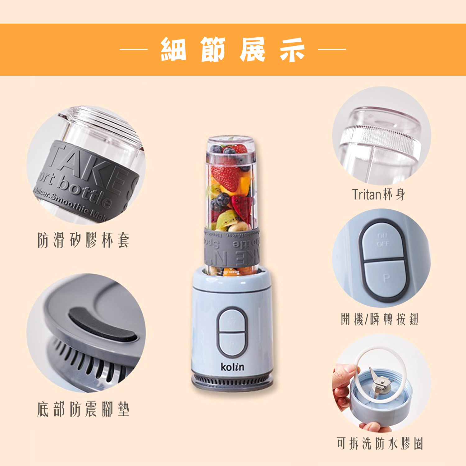 【商品特性】 1.300W高速馬達,可打冰沙。 2.570ml隨行杯,採用Tritan材質,不含雙酚A。 3.1.5mm高厚度隨行杯,耐熱可達100℃。 4.刀頭採用食品級#301不銹鋼,銳利堅硬耐用。 5.按鍵開關,操作簡單。 6.微動開關保護裝置,安全有保障。 7.活動式杯蓋環,方便攜帶。 8.可拆洗式防漏矽膠圈。 9.防震腳墊,防止傾倒,使用安心。 10.機體輕巧,方便收納,造型時尚。