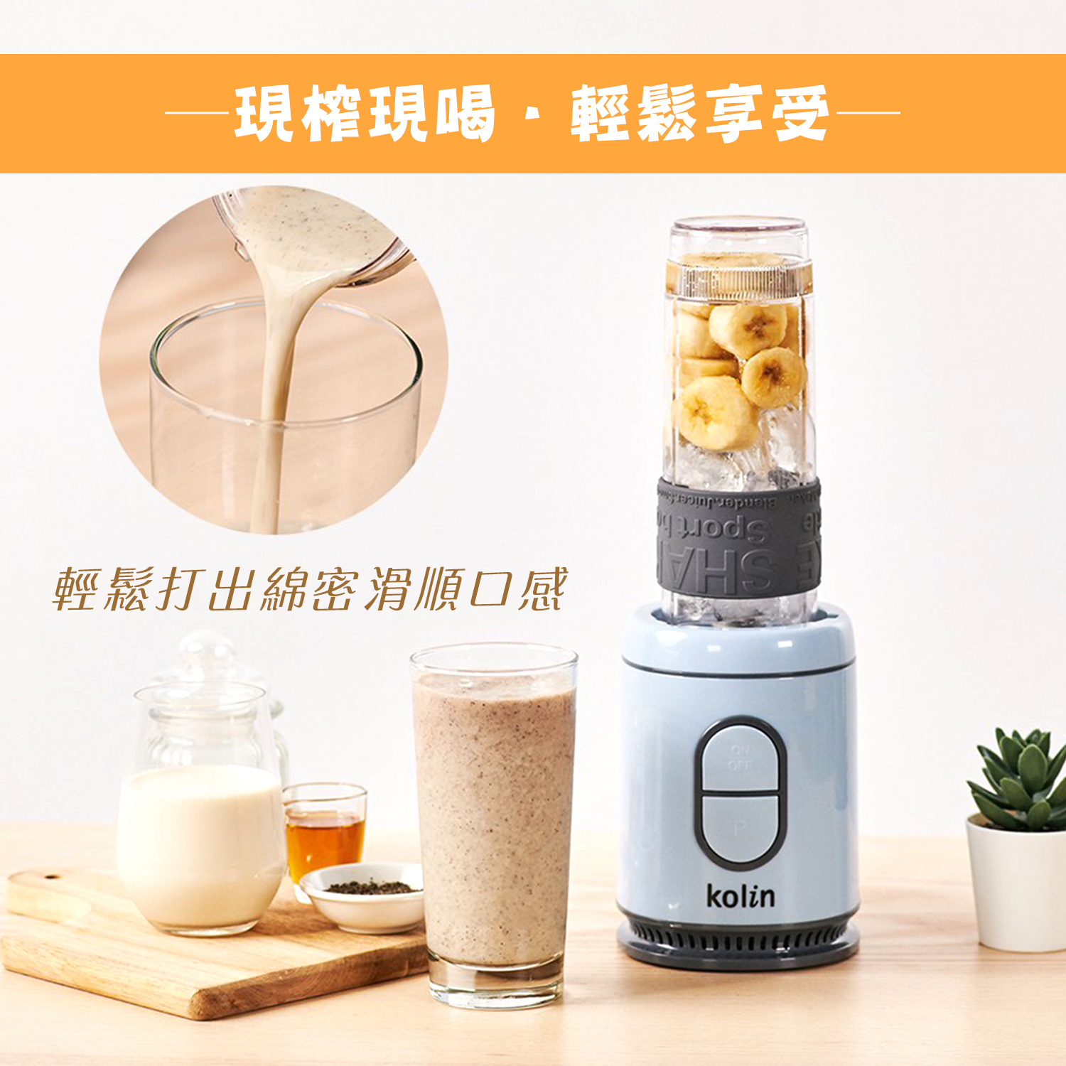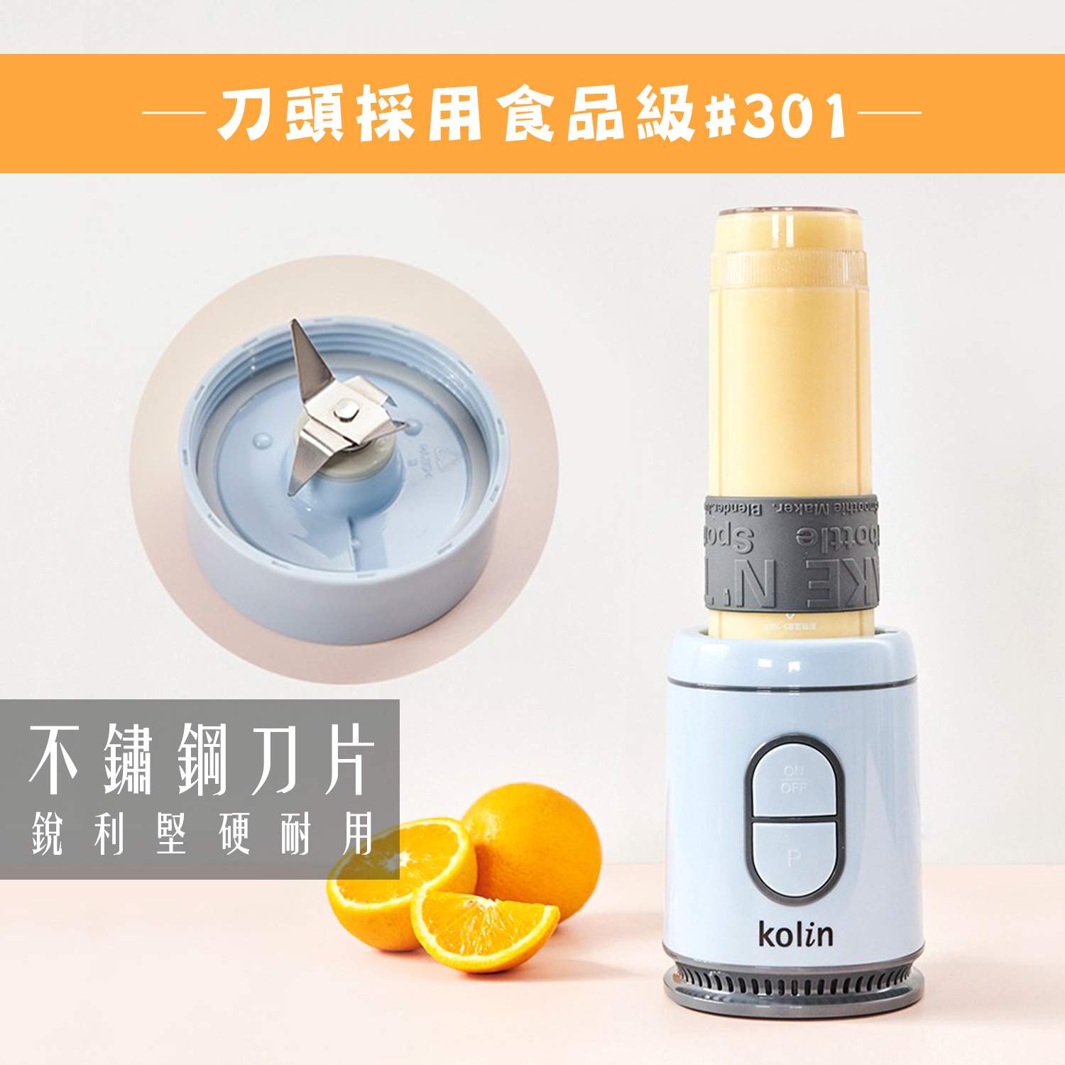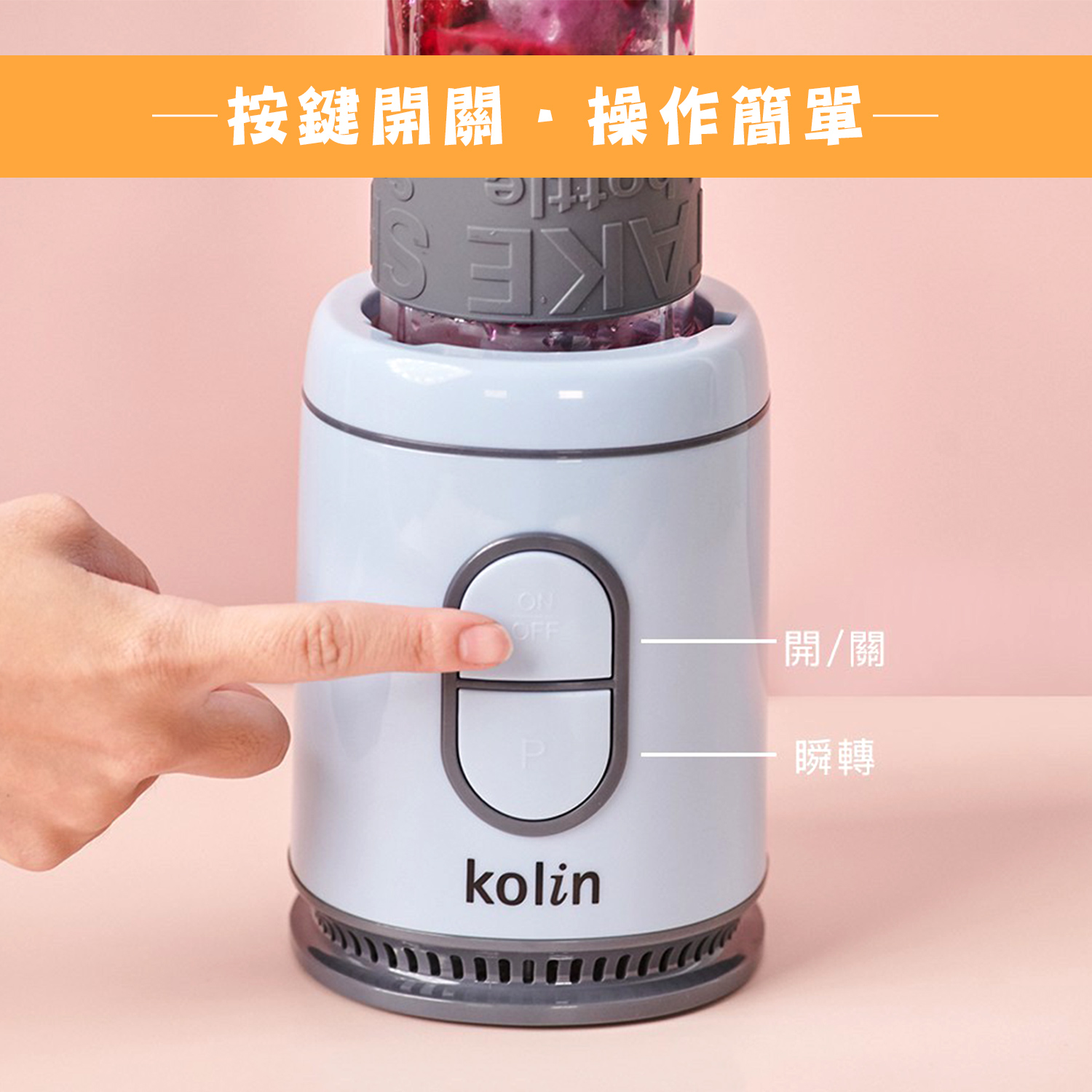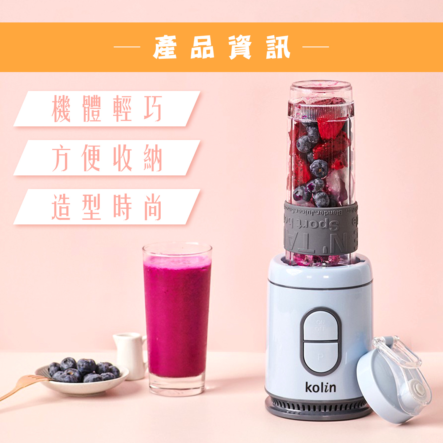 【商品特性】 1.300W高速馬達,可打冰沙。 2.570ml隨行杯,採用Tritan材質,不含雙酚A。 3.1.5mm高厚度隨行杯,耐熱可達100℃。 4.刀頭採用食品級#301不銹鋼,銳利堅硬耐用。 5.按鍵開關,操作簡單。 6.微動開關保護裝置,安全有保障。 7.活動式杯蓋環,方便攜帶。 8.可拆洗式防漏矽膠圈。 9.防震腳墊,防止傾倒,使用安心。 10.機體輕巧,方便收納,造型時尚。