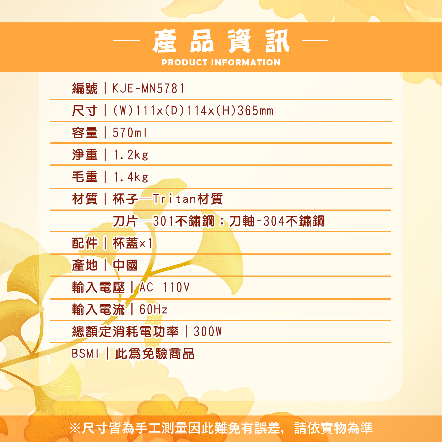 編號|KJE-MN5781尺寸|(W)111x(D)114x(H)365mm容量|570ml淨重|1.2kg毛重|1.4kg材質|杯子─Tritan材質 刀片─301不鏽鋼;刀軸-304不鏽鋼配件|杯蓋x1產地|中國輸入電壓|AC 110V輸入電流|60Hz總額定消耗電功率|300WBSMI|此為免驗商品