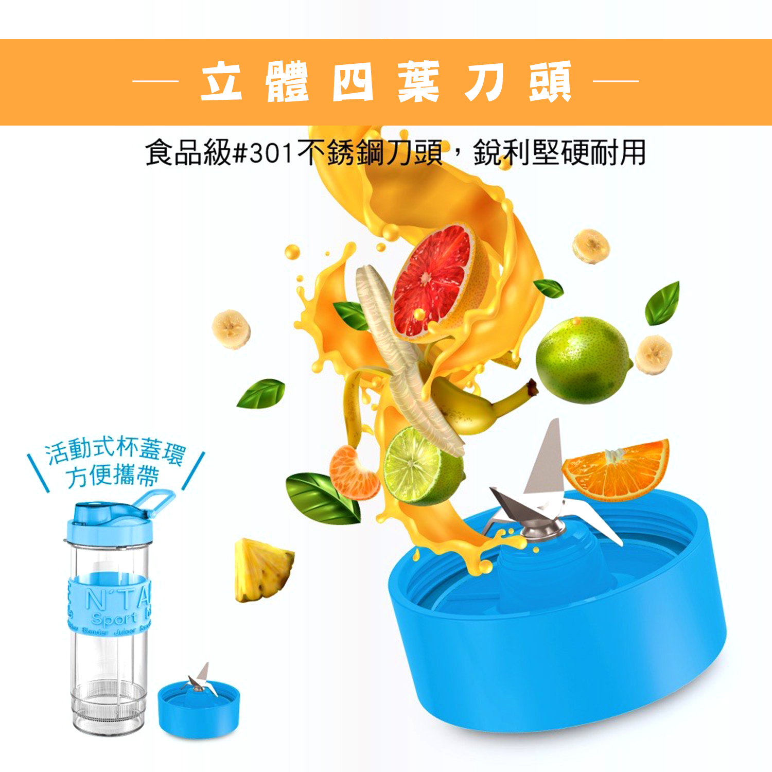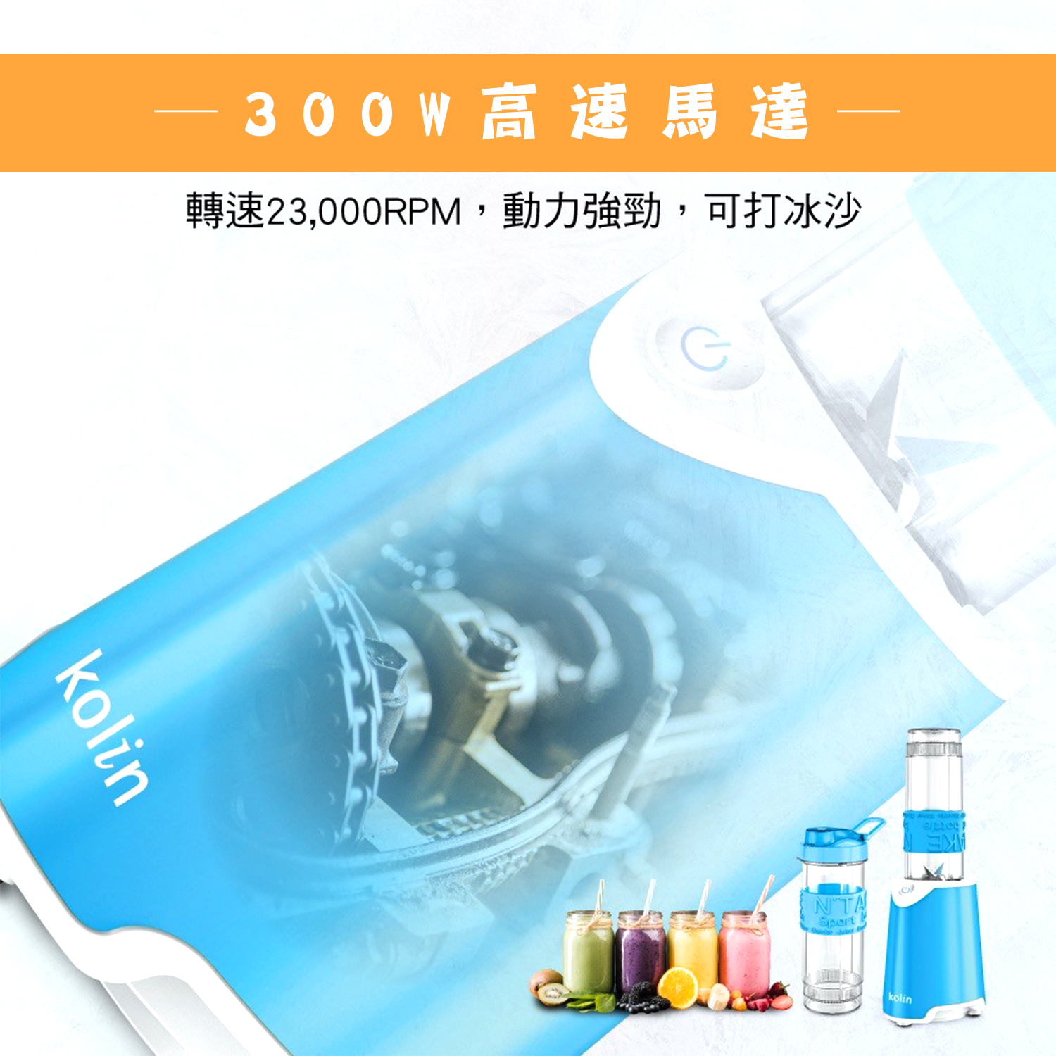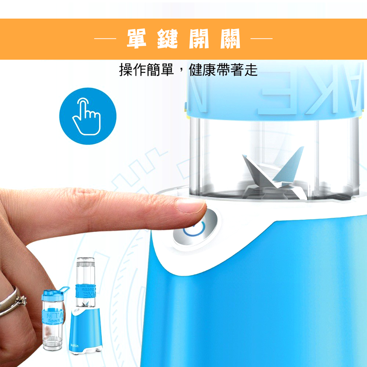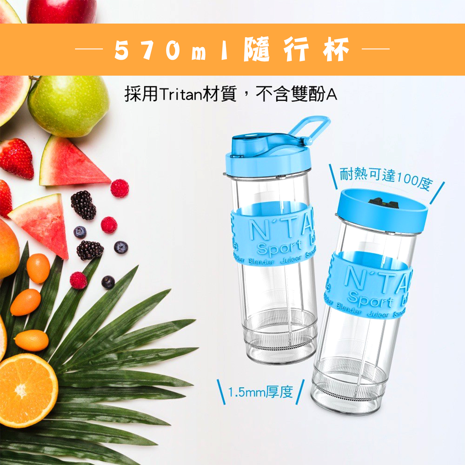 【商品特性】 1.300W高速馬達,可打冰沙。 2.兩組570ml隨行杯,採用Tritan材質,不含雙酚A。 3.1.5mm高厚度隨行杯,耐熱可達100℃。 4.刀頭採用食品級#301不銹鋼,銳利堅硬耐用。 5.單鍵開關,操作簡單。 6.微動開關保護裝置,安全有保障。 7.活動式杯蓋環,方便攜帶。 8.可拆洗式防漏矽膠圈。 9.防震腳墊,防止傾倒,使用安心。 10.機體輕巧,方便收納,造型時尚。