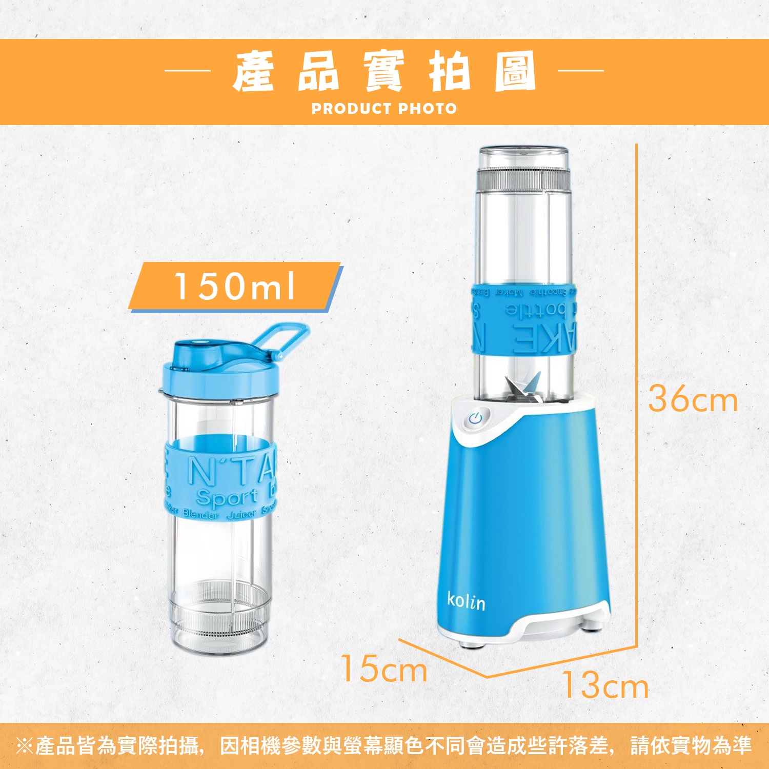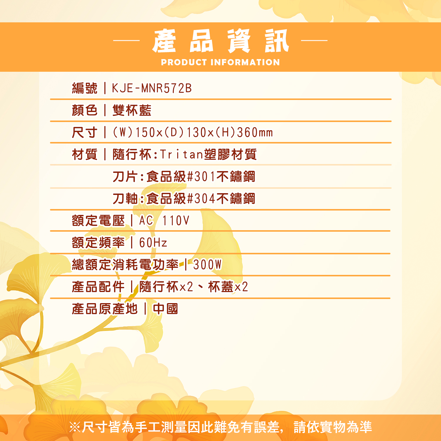 編號|KJE-MNR572B顏色|雙杯藍尺寸|(W)150x(D)130x(H)360mm材質|隨行杯:Tritan塑膠材質 刀片:食品級#301不鏽鋼 刀軸:食品級#304不鏽鋼額定電壓|AC 110V額定頻率|60Hz總額定消耗電功率|300W產品配件|隨行杯x2、杯蓋x2產品原產地|中國BSMI|R37945