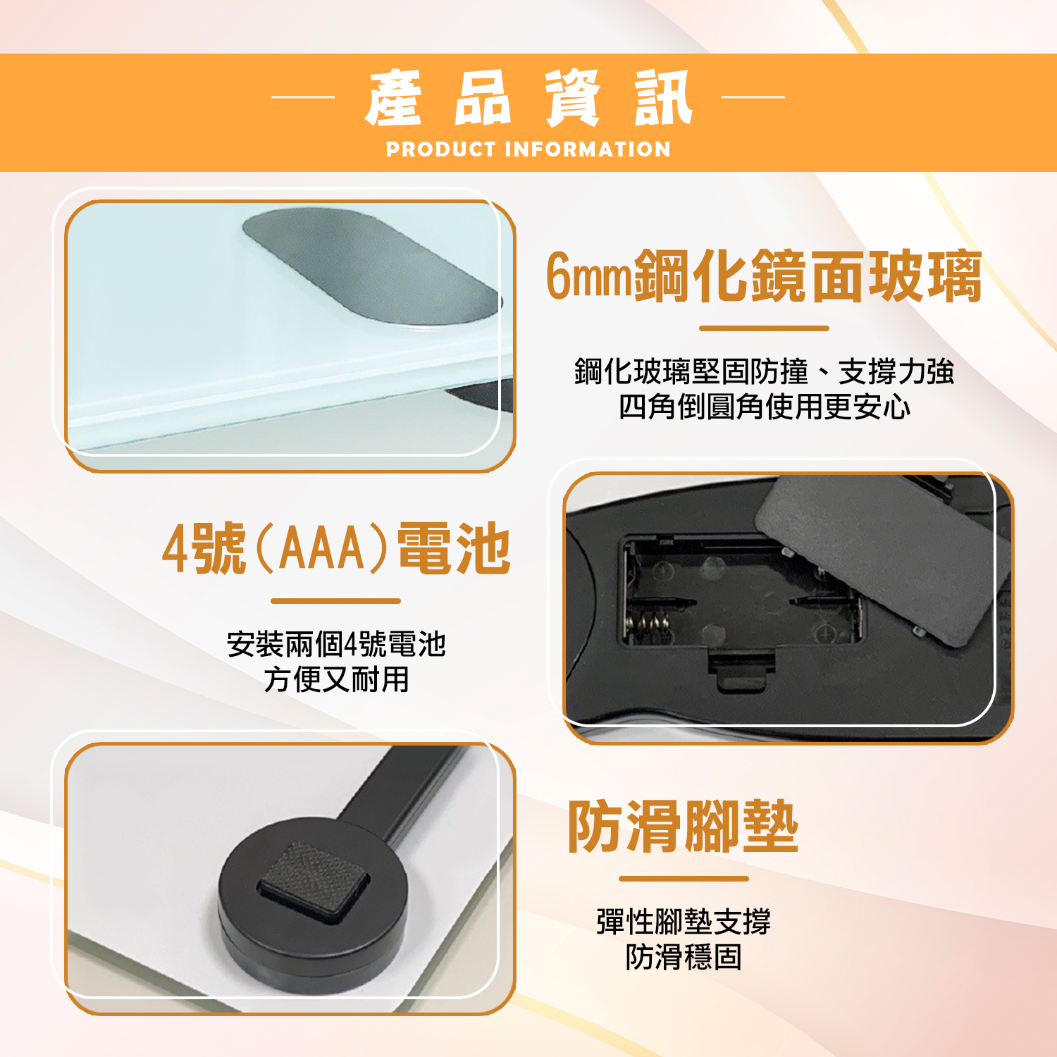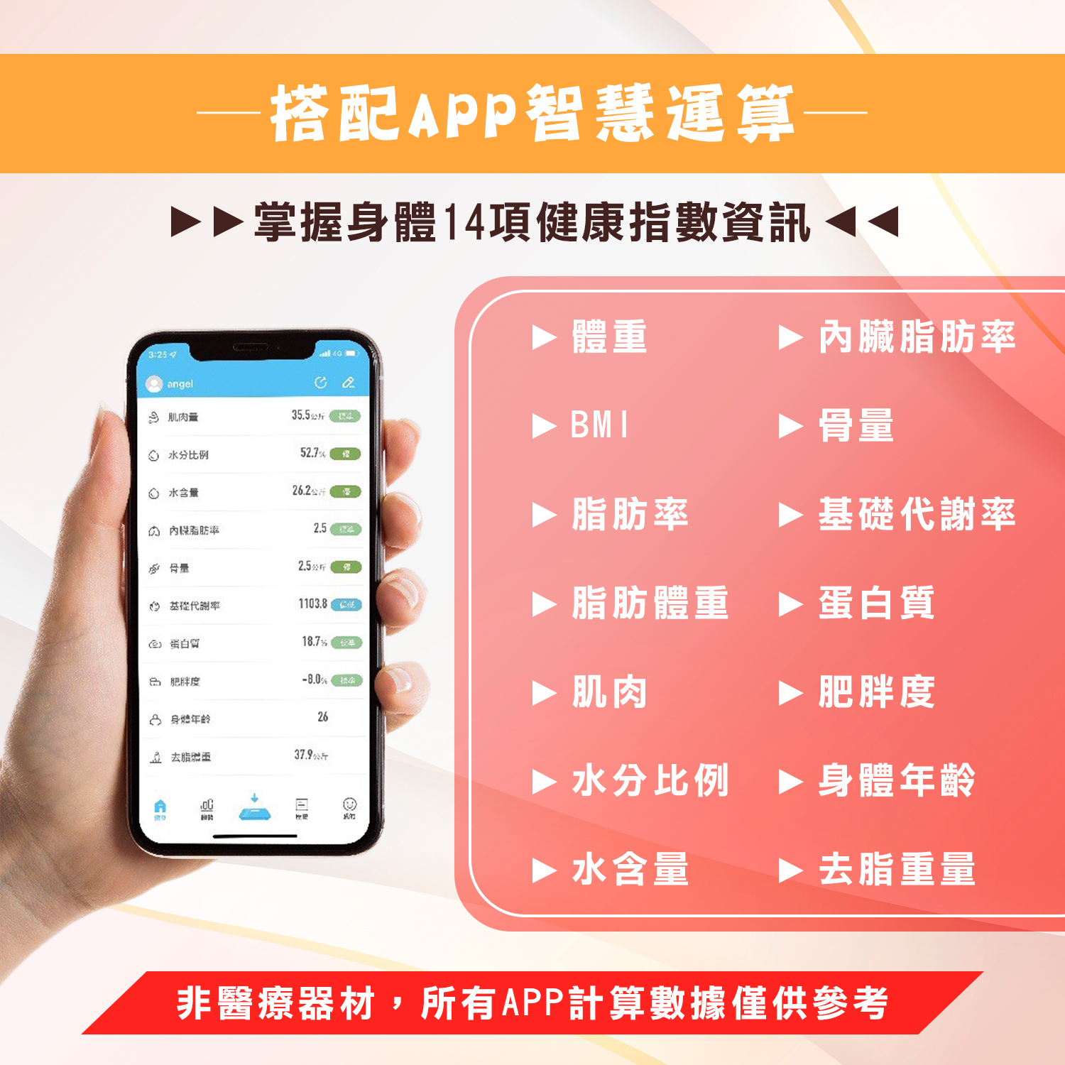 【商品特性】 1.健康管理,從體重追蹤開始。 2.智能藍牙App連結。 3.可儲存8位成員資料 4.十二項身體健康檢測數據。 5.LCD顯示螢幕,6mm厚高強度鋼化玻璃。 6.內建三種單位轉換 kg(公斤) / lb(磅) / st (英制磅)。 7.高精準度測重傳感器,測量範圍5~180kg。 8.即站即秤,15秒自動關機省電功能。 9.底部防滑墊設計,安全穩固。
