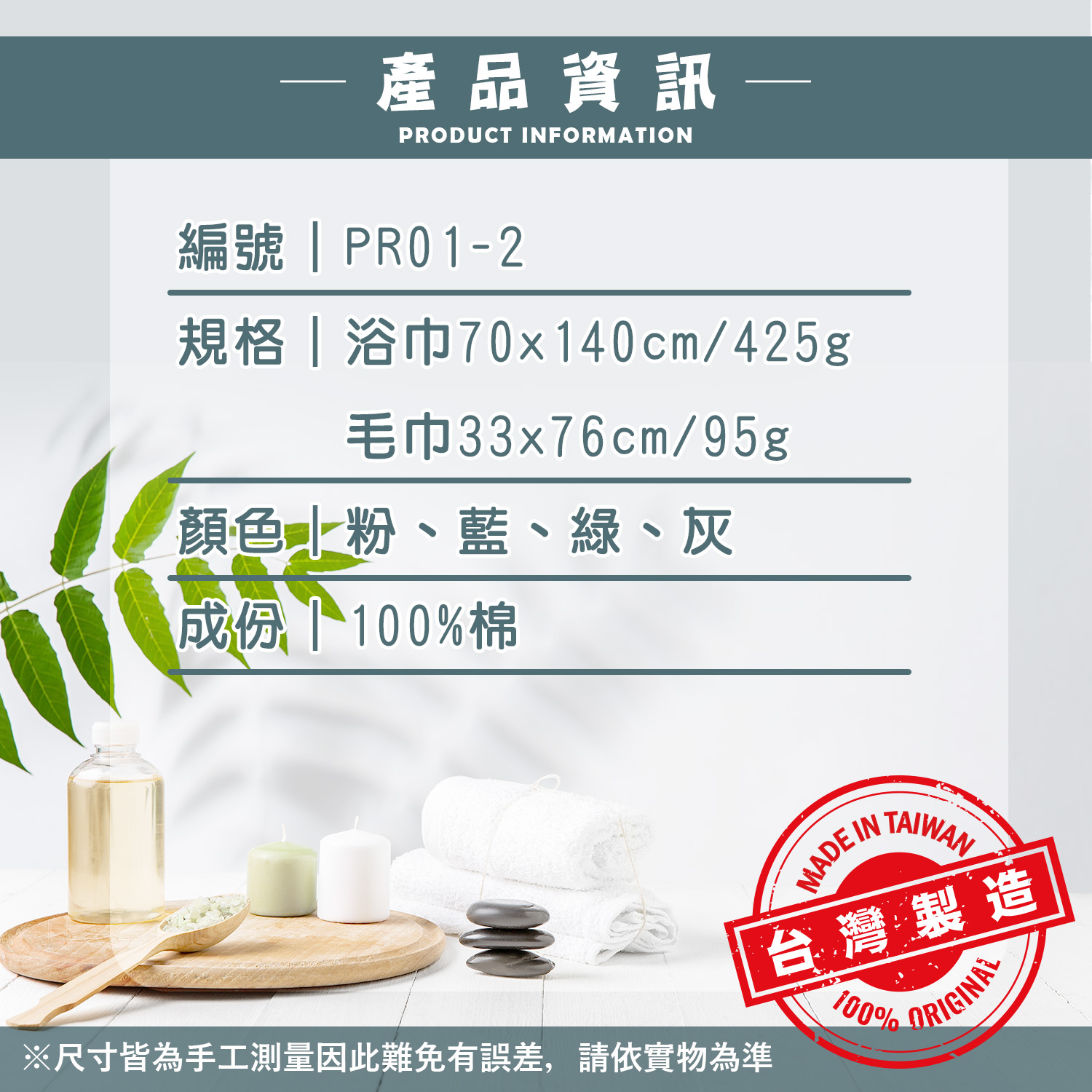 編號|PR01-2規格|浴巾70x140cm / 425g 毛巾33x76cm / 95g顏色|粉、藍、綠、灰成份|100%棉製程|全程台灣製造