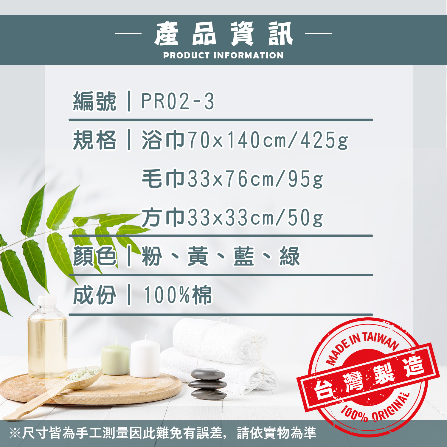 編號|PR02-3規格|浴巾70x140cm / 425g 毛巾33x76cm / 95g 方巾33x33cm / 50g顏色|粉、黃、藍、綠成份|100%棉製程|全程台灣製造