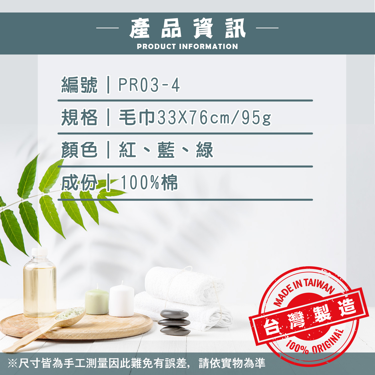 編號|PR03-4規格|毛巾33x76cm / 95g顏色|紅、綠、藍成份|100%棉製程|全程台灣製造