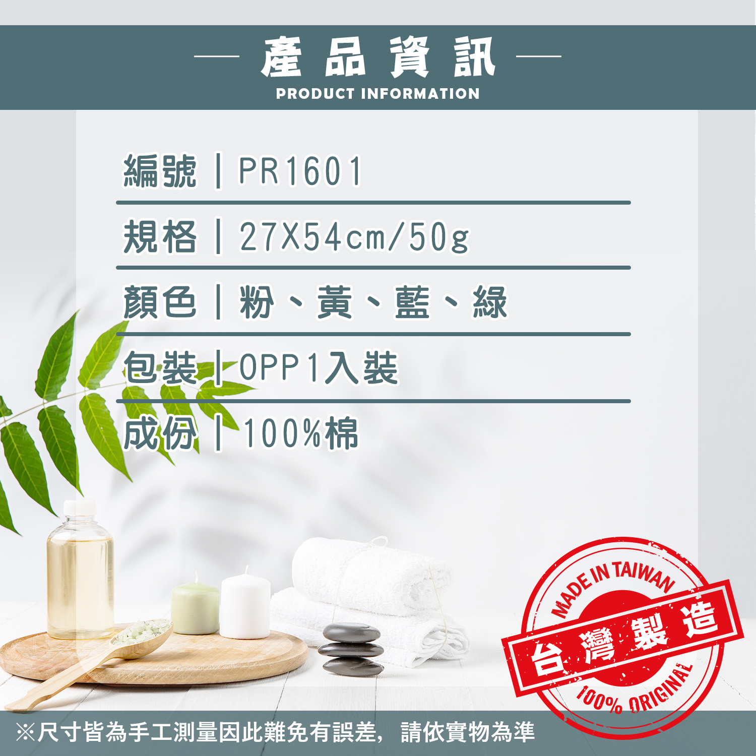 編號|PR1601規格|27X54cm/50g 顏色|粉、黃、藍、綠 包裝|OPP1入裝成份|100%棉製程|全程台灣製造