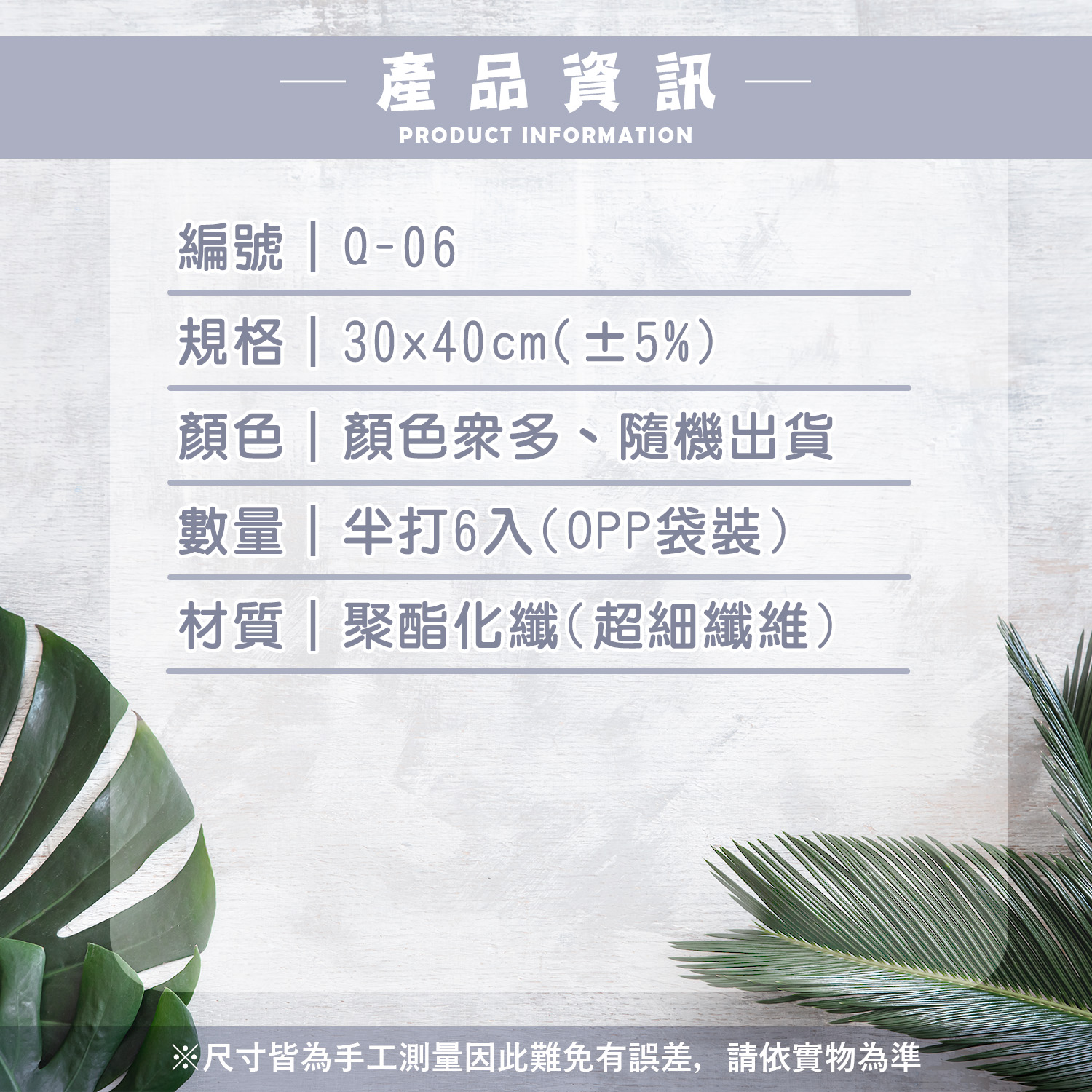 編號|Q-06規格|30x40cm(±5%)顏色|顏色眾多、隨機出貨數量|半打6入(OPP袋裝)材質|聚酯化纖(超細纖維)