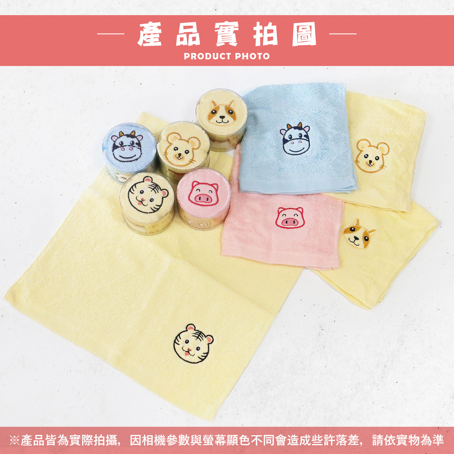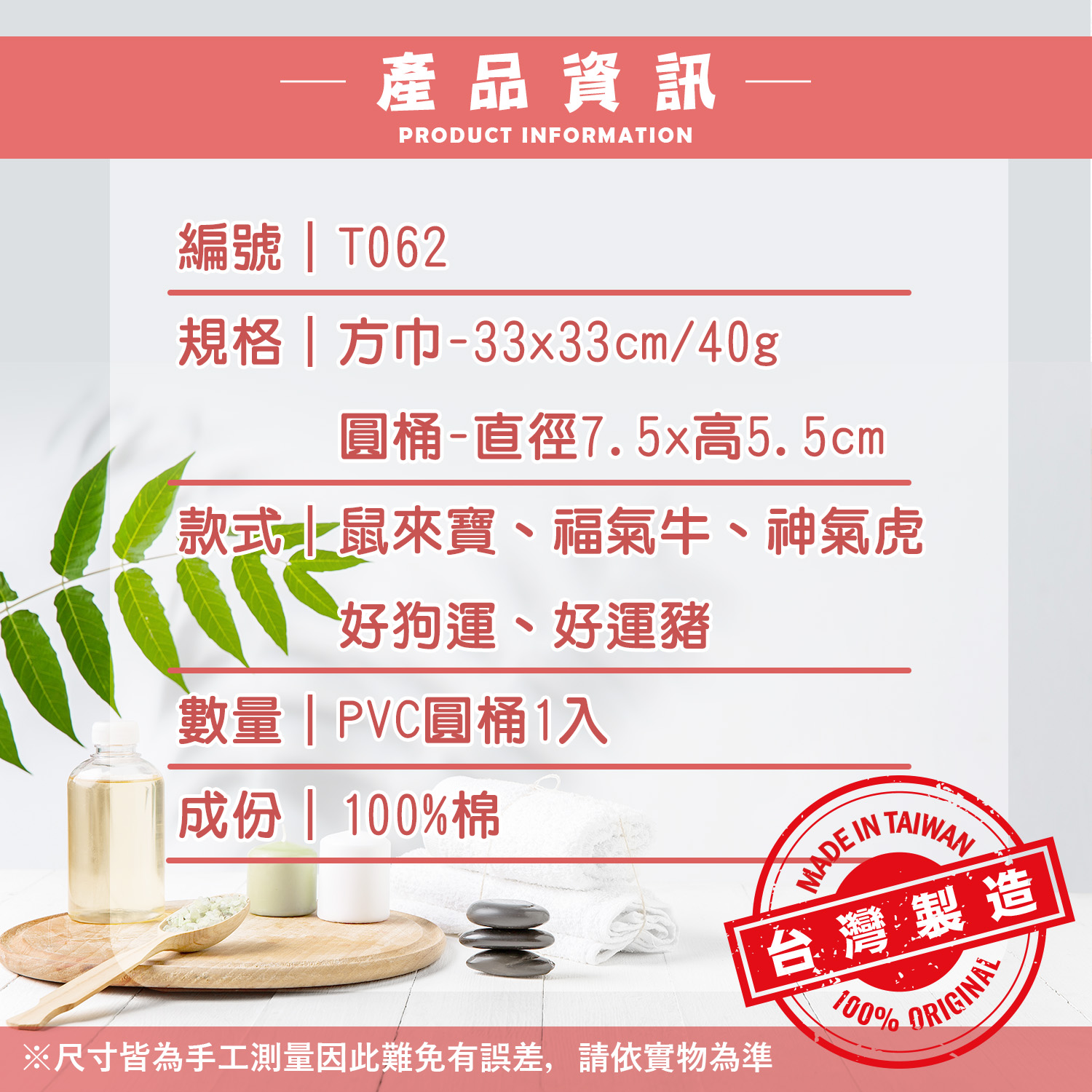 編號|T062規格|方巾-33x33cm / 40g 圓桶-直徑7.5x高5.5cm款式|鼠來寶、福氣牛、神氣虎 好狗運、好運豬數量|PVC圓桶1入成份|100%棉製程|全程台灣製造
