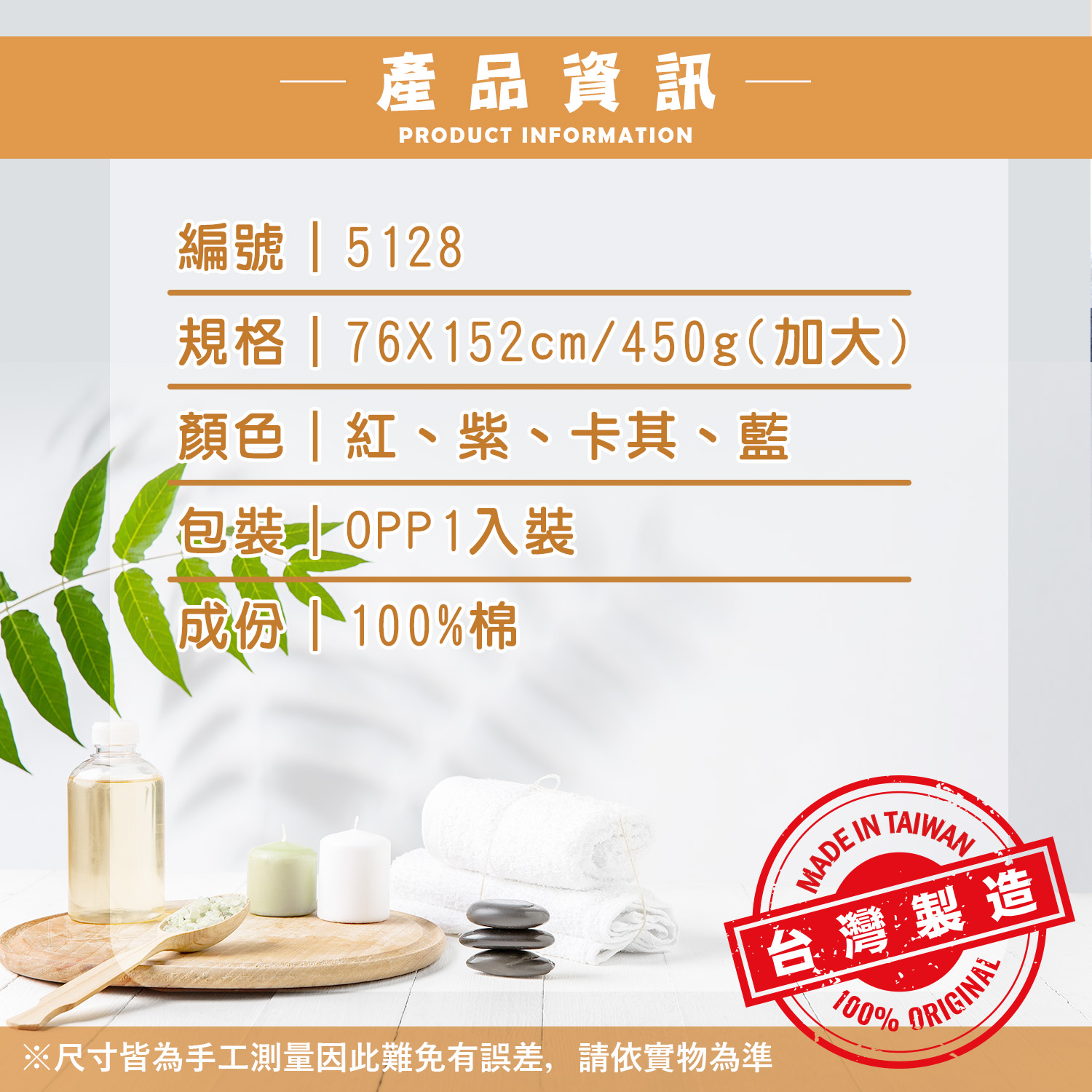編號|5128規格|76X152cm / 450g 顏色|紅、紫、卡其、藍 包裝|OPP1入裝成份|100%棉製程|全程台灣製造