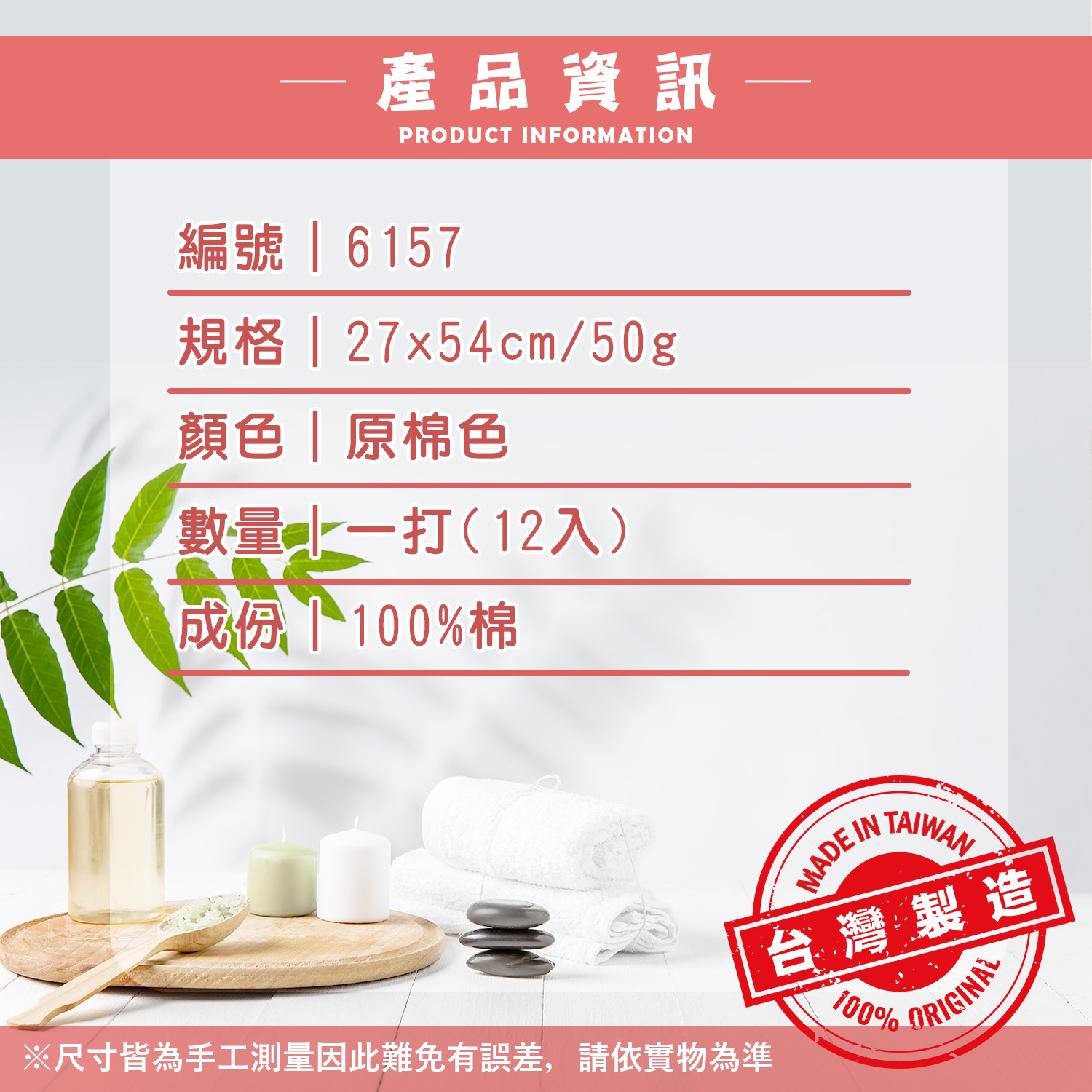 編號|6157規格|27x54cm / 50g 顏色|原棉色款式|三種款式各四條數量|一打(12入) 成份|100%棉製程|全程台灣製造