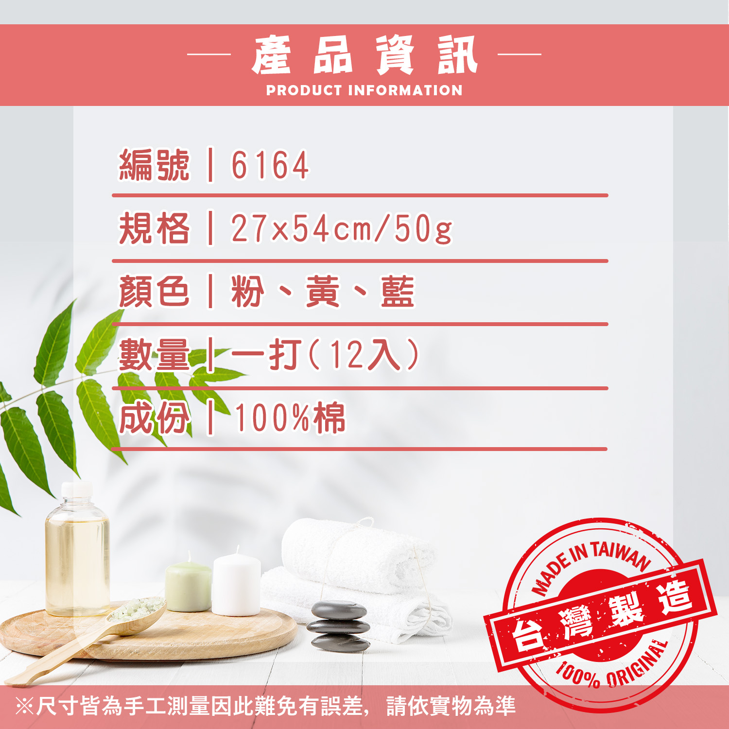 編號|6164規格|27x54cm / 50g 顏色|粉、黃、藍,三色各四條數量|一打(12入)成份|100%棉製程|全程台灣製造