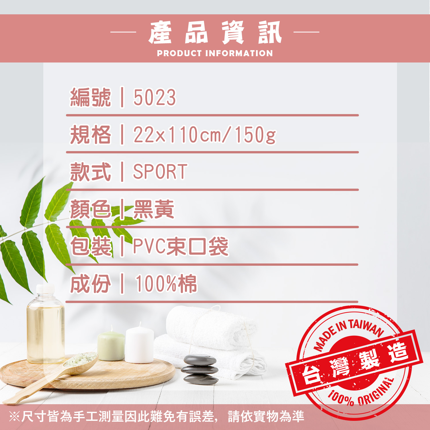 編號|5023規格|22x110cm / 150g款式|SPORT顏色|黑黃包裝|PVC束口袋成份|100%棉製程|全程台灣製造